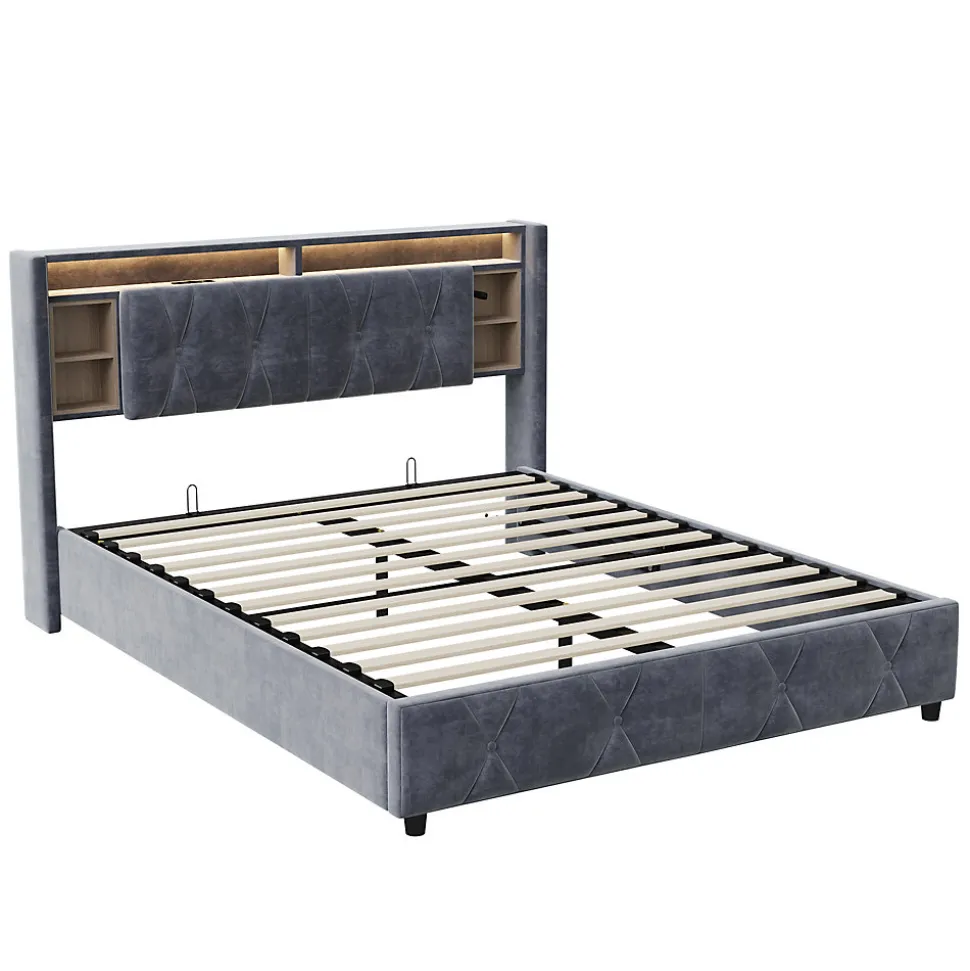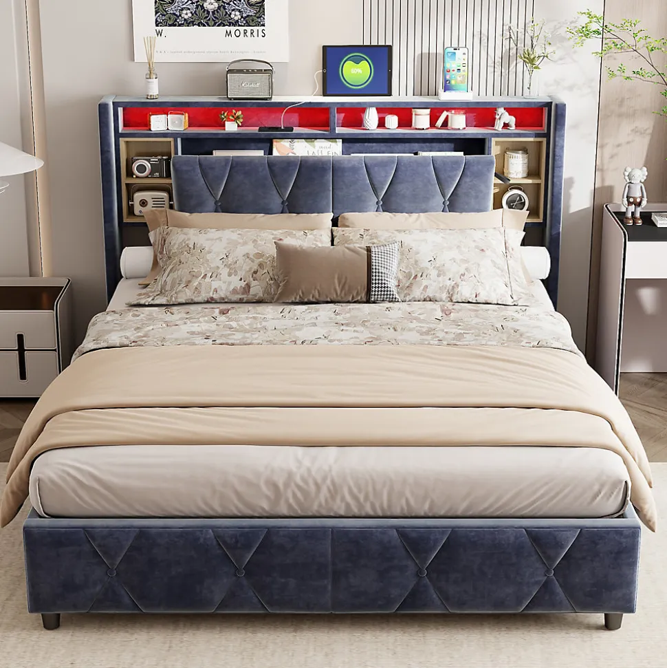 Lit double avec LED et rangement 140×200 cm – Velours GrisCe lit rembourré en velours doux et élégant ajoute une touche de luxe à votre chambre. La tête de lit avec LED intégrée vous permet de créer l’ambiance parfaite pour la lecture ou le repos, avec un contrôle facile de la couleur et de l’intensité via télécommande.Le lit offre un espace de rangement flexible sous le sommier à lattes, parfait pour stocker des articles comme des vêtements ou des couvertures. Sa structure robuste en bois massif et métal assure un excellent soutien et une longue durabilité.Montage requis.Matelas non inclus.Livré en 2 colis.Dimensions totales : 145 × 212 × 107 cmMatelas compatible : 140 × 200 cmPoids du produit : 44 kg