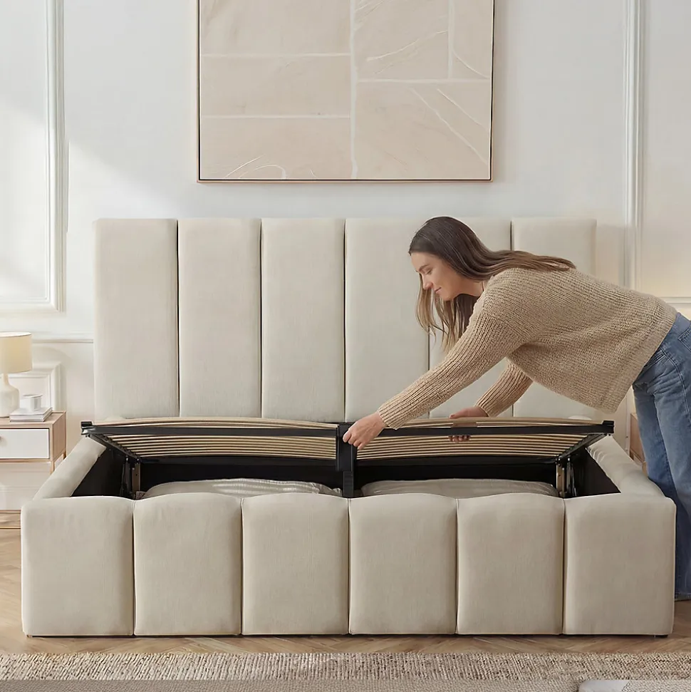 - PRATICITE : Grâce aux vérins hydrauliques, l’ouverture du coffre de rangement intégré se fait en douceur, offrant un vaste espace pour organiser linge de lit et accessoires.