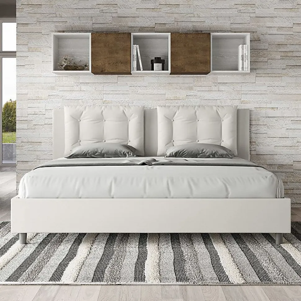 Lit king size 180×200 Annalisa avec tête de lit et lit rembourrés, revêtement en simili cuir, particulièrement polyvalent et facilement combinable avec n’importe quel style d’ameublement.Le lit king size Annalisa 180×200 se caractérise par un style élégant et raffiné grâce aux larges coussins de la tête de lit, il est entièrement recouvert de simili cuir.La présence du matériau en simili cuir, en plus de donner à la pièce une atmosphère accueillante et invitante, offre la commodité d’un nettoyage rapide et facile, grâce à l’utilisation d’un simple chiffon en microfibre.Lit fourni avec sommier à rangement, prévu pour un matelas 180×200 cm – Matelas non inclusCouvre-lit non amovible.Produit ItyhomeFabriqué en ItalieDimensions lit : L.195 P.212 H.110 cmHauteur des pieds : 12 cmHauteur du lit : 27 cmHauteur du filet depuis le sol : 39 cmDimensions intérieures du conteneur : L.183 P.204 H.21 cm