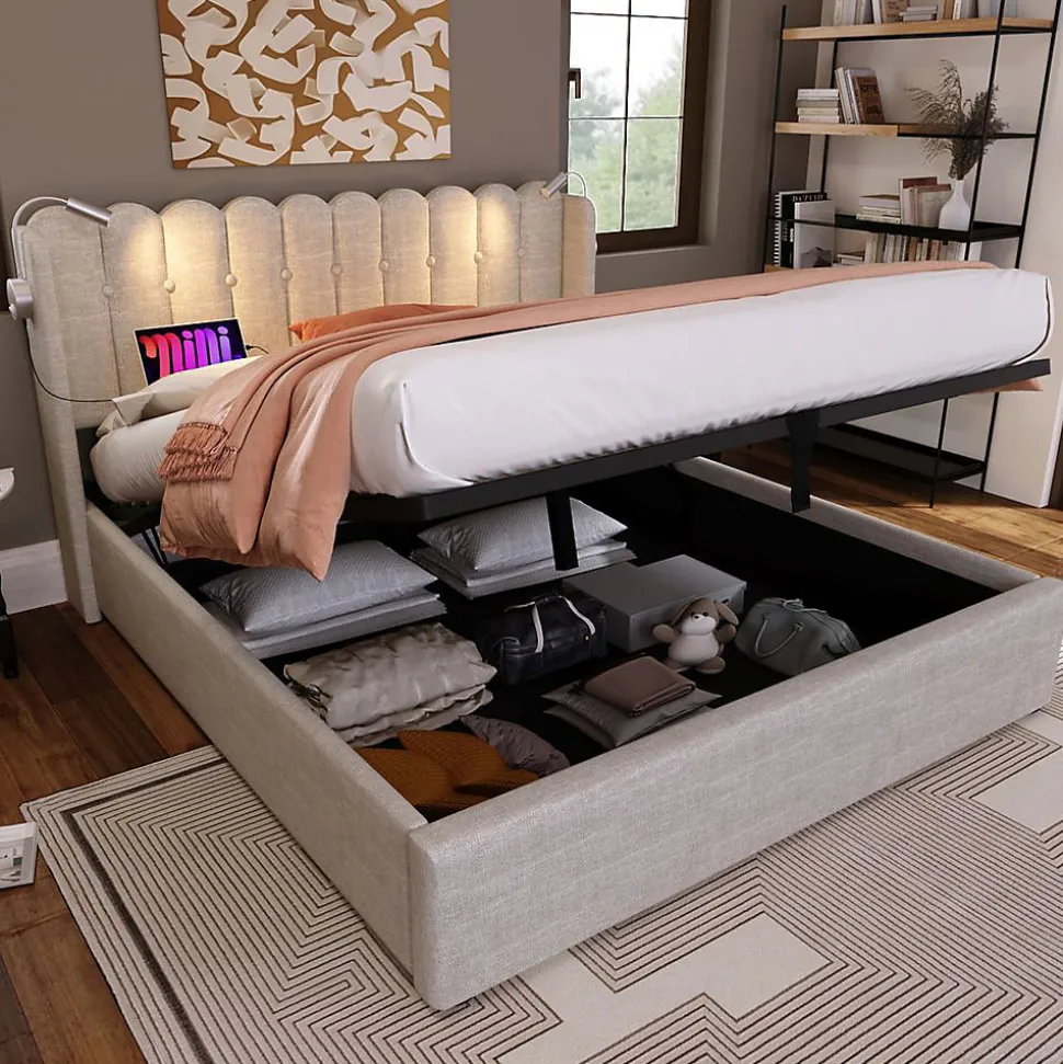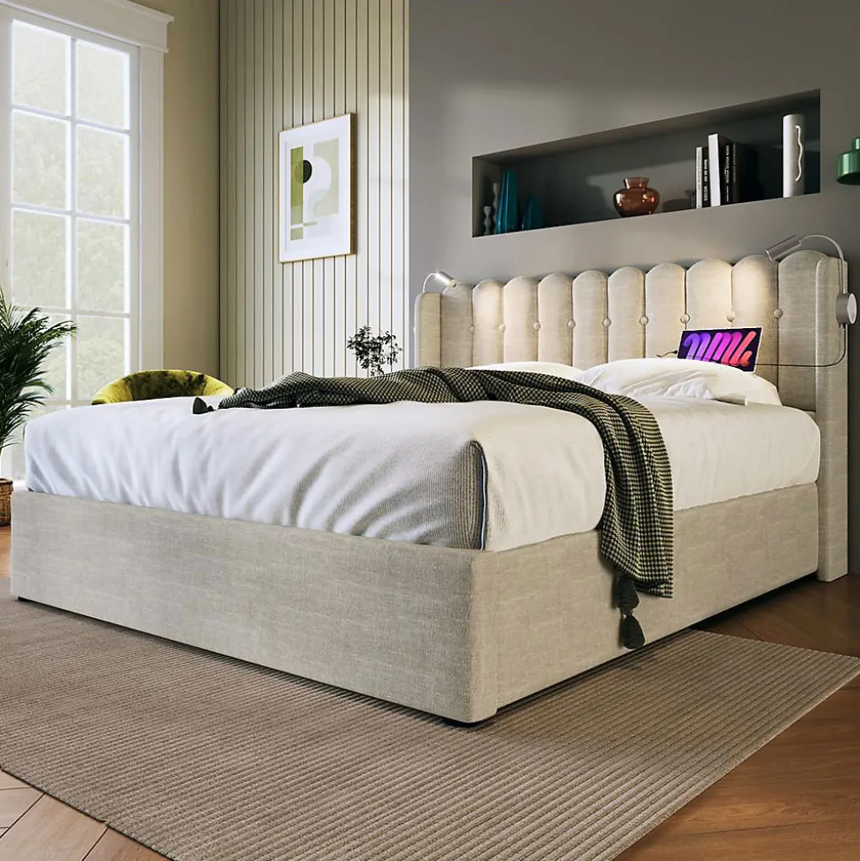 Lit double 160×200 cm en lin avec rangements et éclairageCaractéristiques principales :Dimensions : 160×200 cm (206x165x103 cm assemblé)Matériau : Lin naturel + structure métallique (charge max 300 kg)Couleur : NaturelPoids : 45,29 kg (2 colis)Fonctionnalités : ✔ Tête de lit avec rangement intégré ✔ Lampe de lecture réglable + 2 ports USB ✔ Système de rangement sous le lit avec accès pneumatique ✔ Sommier lattes inclusAvantages :Ambiance chaleureuse et design contemporainStructure métallique robuste et durableÉclairage et recharge intégrés pour plus de confortLivré en 2 colis (assemblage nécessaire)Informations pratiques :Hauteur tête de lit : 25 cmConvient pour matelas 160×200 cm (non inclus)Dimensions colis : 1198x31x14 cm + 1165x50x15,5 cmLivraison possiblement décalée entre colisIdéal pour chambres d’ado ou adultes recherchant fonctionnalité et confort.