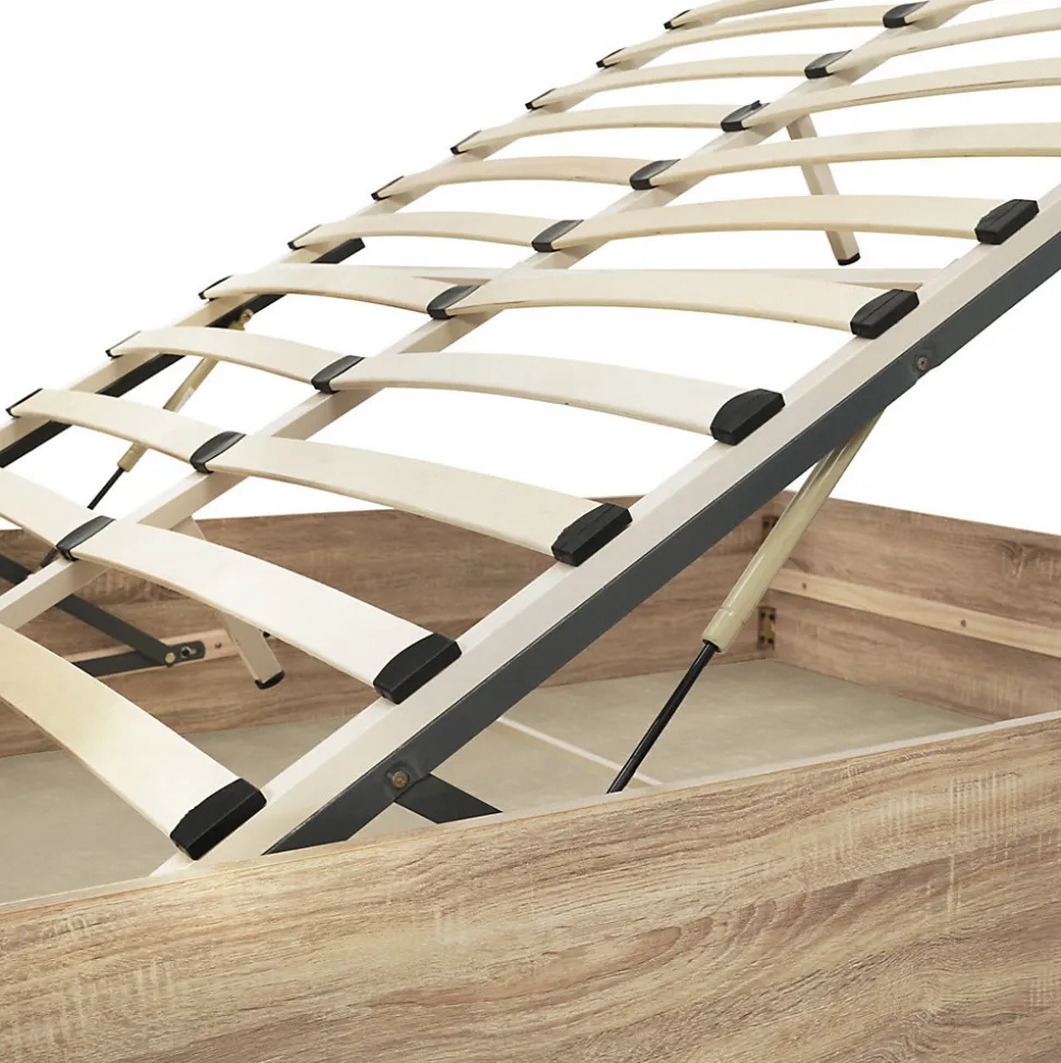 Apportez une touche moderne à votre chambre à coucher avec le lit coffre double avec sommier et tête de lit SEASIDE 160 x 200 cm ! Avec son coloris hêtre passe partout, le design épuré de ce lit double s’intègrera parfaitement à tous types de décoration intérieure ! En plus d’avoir des finitions soignées, la structure du lit, pratique et fonctionnelle, abrite sous son sommier un grand coffre de rangement. Vous pourrez facilement y accéder grâce aux vérins de levage. Celui-ci vous permet d’y entreposer vos valises, votre linge de maison ou tout autre objet afin de conserver un espace nuit ordonné.Le lit SEASIDE est également composé d’une grande tête de lit qui habillera votre mur et vous apportera le confort et le soutien nécessaire pour vous adosser le soir en regardant un film ou pour lire un livre avant de vous endormir.Stable et robuste, ce coffre de lit est composé d’un sommier 24 lattes en bois tout confort et d’une barre transversale sous le sommier avec 2 pieds en métal centraux.Craquez pour le lit coffre double SEASIDE et apportez style et praticité dans votre chambre à coucher ! Dimensions du lit coffre SEASIDE 160 x 200 CMDimensions globales : Longueur 206 cm x largeur 168 cm x Hauteur 900 cmDimension de la tête de lit : L. 168 x l. 2 x H. 90 cmHauteur du cadre : 30 cmNombre de lattes : 24 lattes de 5 cm de large – espacées de 11 cmMatériaux : Panneaux de particules / Bois / MétalColoris : boisÀ monter soi-mêmeRetrouvez l’ensemble de notre gamme de lits sur notre boutique en ligne !