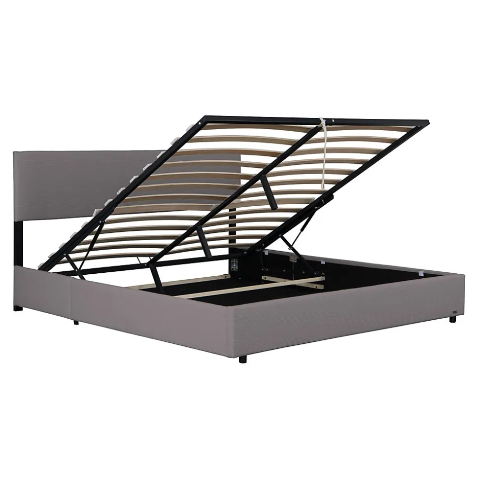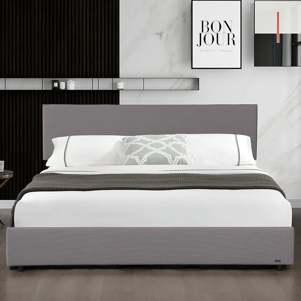 Lit coffreCe cadre de lit moderne s’intègre parfaitement dans différents styles d’aménagement. Son montage est simple et facile gâce à un design bien pensé et à des instructions clairement structurées.Le coffre de lit spacieux situé sous le sommier à lattes porteur et rabattable sert d’espace de rangement pratique pour le linge de lit, les oreillers et autres objets. Cette construction confère au matelas une base stable et favorise un sommeil profond.Points forts du produit :- lit simple et élégant- convient à différents styles d’aménagement- le sommier à lattes constitue un support stable pour le matelas- le coffre de lit généreux crée un espace de rangement- tête de lit rembourrée pour un confort supplémentaire- stabilité assurée gâce à 6 pieds robustes- montage rapide- capacité de charge jusqu’à 300 kgDimensions :- totales (lo x la x h) : 212,5 x 148 x 96,5 cm- matelas (lo x la) : 200 x 140 cm- hauteur des bords du lit : 29 cmMatière :- structure : bois + métal- housse : velours côtelé (100% polyester)Couleur :grisContenu de la livraison :1 x cadre de lit avec sommier à lattes rabattableRemarque :Pour des raisons logistiques, le retrait par le client n’est pas disponible. La livraison est effectuée jusqu’au trottoir ou à la porte d’entrée, sans montage.Important :Attention ! La commande est indiquée hors matelas, couverture, coussins et produits de décoration.Produit de la marque Corium®.