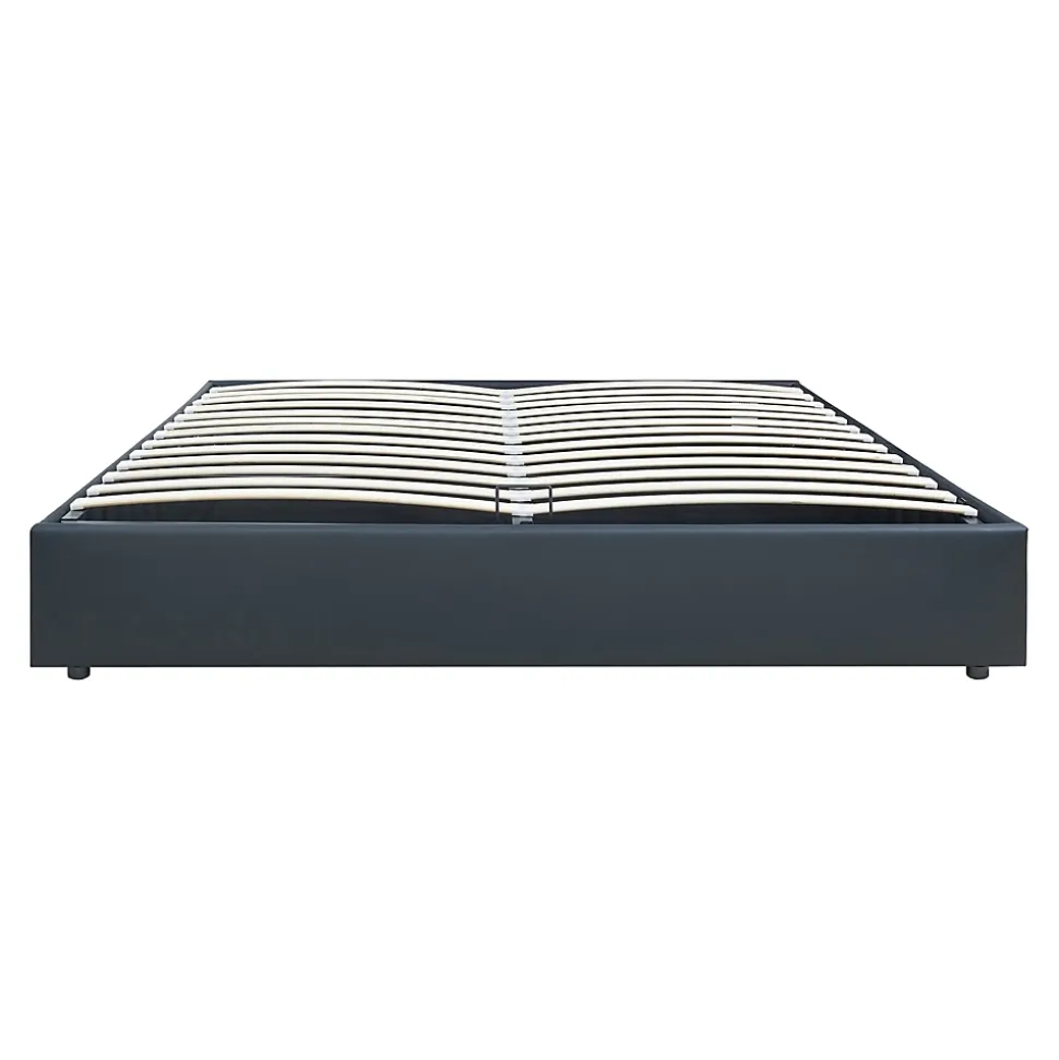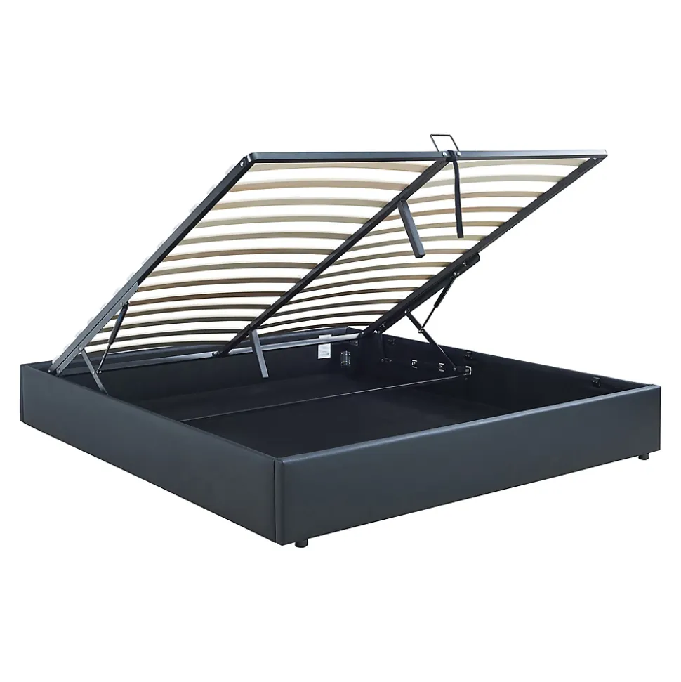 Lit coffreCe lit coffre allie élégance et praticité. Son design raffiné crée une atmosphère chaleureuse tout en offrant un couchage confortable, adapté à tous les styles d’intérieur.Le sommier relevable, équipé de vérins à gaz, révèle un grand espace de rangement idéal pour la literie et les accessoires. Sa structure robuste assure une excellente stabilité et un maintien optimal du matelas.Points forts :- lit double au look sobre et élégant- convient à différents styles d’aménagement- support de matelas stable avec sommier à lattes- le coffre de lit crée un espace de rangement – avec vérins à gaz et poignée pratique- stabilité assurée grâce à 4 pieds robustes- montage rapide et facile- capacité de charge jusqu’à 500 kgDimensions :- totales (lo x la x ha) : 206 x 161 x 27,5 cm- dimensions du matelas (lo x la) : 200 x 160 cmMatière :- cadre de lit : MDF- housse : simili (100% polyuréthane)- sommier : contreplaqué (entretoises) + métal (cadre)- pieds : plastiqueCouleur :noirContenu de la livraison :1 x cadre de lit avec sommier à lattes rabattableImportant :Le matelas, les coussins, la couverture et tous les autres objets de décoration ne sont pas compris dans la livraison !Remarque :Pour des raisons logistiques, le retrait par le client n’est pas disponible. La livraison est effectuée jusqu’au trottoir ou à la porte d’entrée, sans montage.Produit de la marque :[en.casa]