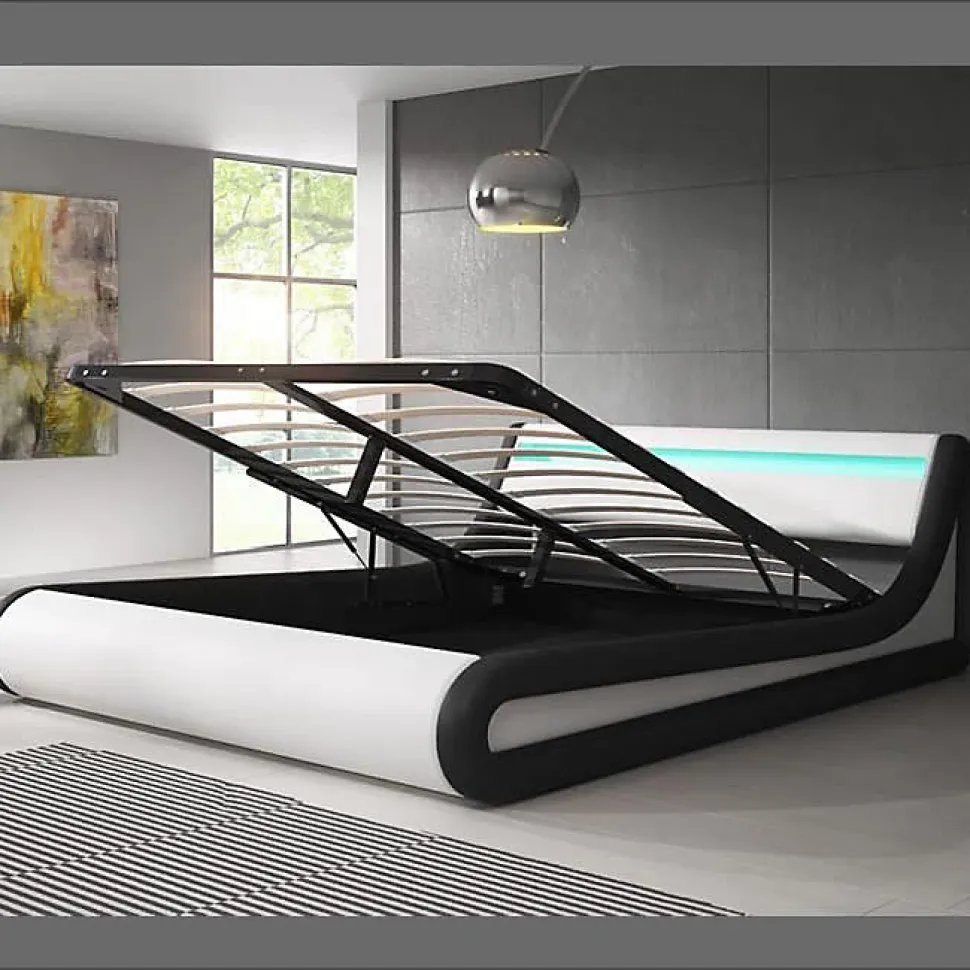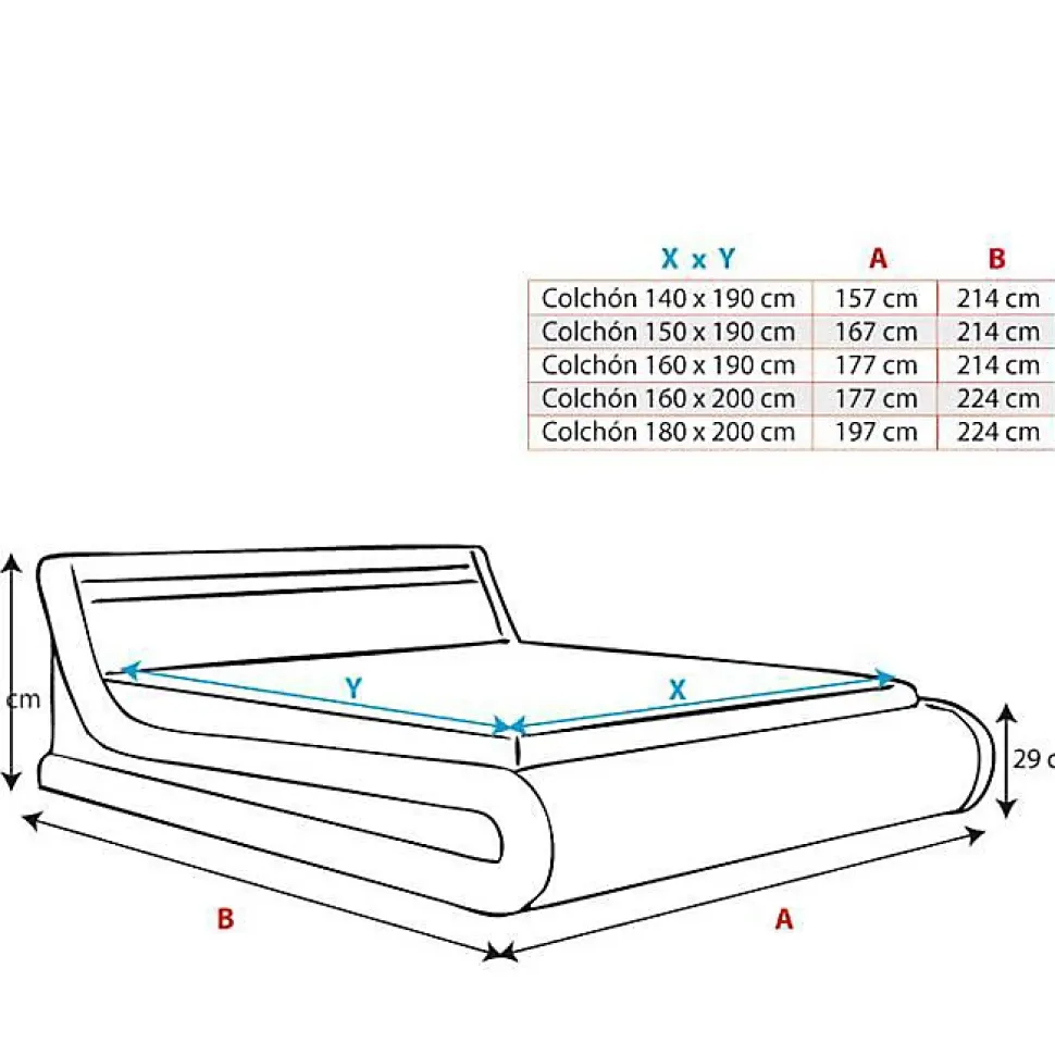 Caracteristiques du produit**Lit coffre PARISINA 180×200 cm** en bois recouvert de similicuir blanc et noir pour un design contemporain et élégant**Matelas TEXAS inclus** : matelas ferme et homogène, hauteur ~16 cm, noyau haute densité pour un bon soutien**Sommier à lattes** avec 24 lattes et cadre métal pour une ventilation et un maintien optimaux**Coffre de rangement** d’une profondeur de 20 cm pour optimiser l’espace sous le sommier**Éclairage LED RGB 16 couleurs** avec télécommande incluse pour personnaliser l’ambiance**Dimensions principales** : longueur produit 224 cm, largeur 197 cm, hauteur tête 65 cm, hauteur cadre 29 cm**Structure et matériaux**La structure est en bois (MDF/bois massif selon éléments) recouverte de similicuir PU de haute qualité offrant une finition résistante et facile à entretenir. Le sommier intègre **24 lattes** sur cadre métal garantissant robustesse et durabilité.**Matelas TEXAS**Matelas fourni de 16 cm d’épaisseur, noyau haute densité (20–25 kg/m3 selon dimensions) avec couverture en eurotissu rembourré 0,7 cm pour un soutien ferme et un confort homogène qui réduit les points de pression.**Rangement et fonctionnalité**Le lit coffre propose un espace de stockage pratique sous le sommier (profondeur **20 cm**) accessible par un système de relevage solide, idéal pour couettes, oreillers ou linge de maison.**Éclairage LED**Lumières LED intégrées offrant **16 couleurs** (rouge, vert, bleu, blanc, rose, etc.) contrôlables par télécommande fournie (pile incluse) pour créer diverses ambiances dans la chambre.**Caractéristiques techniques**Convient pour couchage **180 x 200 cm**, livré complet avec matelas, sommier et visserie, fabrication Espagne, entretien facile (chiffon humide).