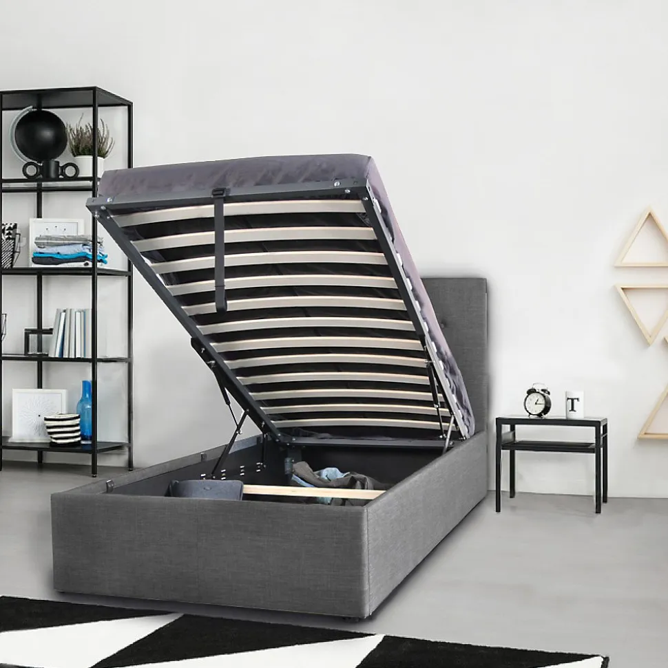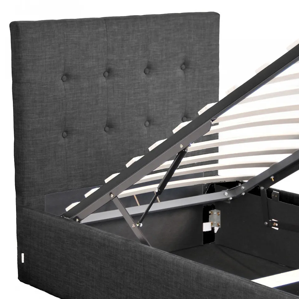 Lit coffre PARMA 90×190 cm / Gris foncéLe lit coffre PARMA est idéal pour les petits espaces. Son design sobre et élégant lui permet de s’adapter à tous les intérieurs. Son avantage: un grand coffre de rangement simple d’utilisation caché sous son sommier!Les PLUS produit:- Grand coffre de rangement de 417 litres- Elégante tête de lit capitonnée incluse- Sommier inclusCaractéristiques:- Coloris : Gris foncé.- Sommier 12 lattes en bois.- Cadre : MDF + Mousse + Tissu.- Tête de lit capitonnée.- Fond du coffre en tissu.Livré démonté en kit, sans matelas. A monter soi-mêmeDimensions:201x99x99 cm