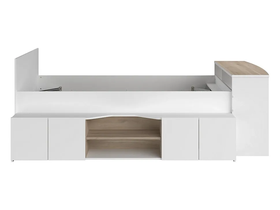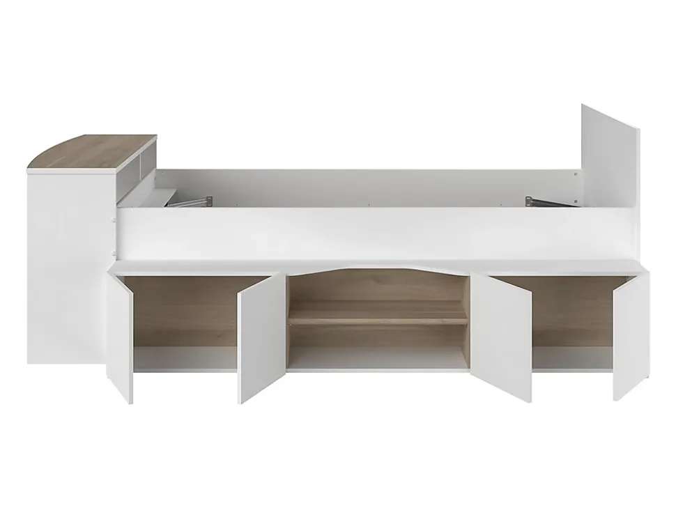 - Lit combiné 90 x 190/200 cm avec bureau et rangements – Structure : Panneaux de particules – Coloris : Blanc et naturel – Dimensions : L115,9 x P240,6 x H90 cm – Style : Moderne + Sommier et matelas – Transformez chaque nuit avec le lit JOCHIANE !
