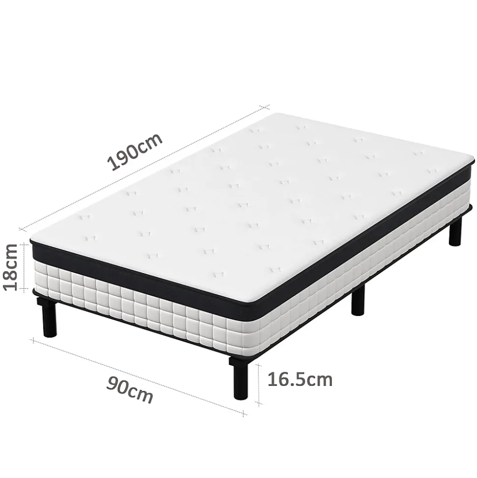 Description du produit:Epaisseur du matelas : 18cm Hauteur des pieds en plastique : 16.5cm Nombre de pieds en plastique : 6 Structure : ① Tissu tricoté : 1cm de mousse matelassée ; 1cm de mousse matelassée bleue ; ② Tissu natif tissé : 1cm de mousse haute densité ; ③ Feutre de coton : 15cm de ressorts ensachés de 1.9mm ; ④ Feutre de coton : Tissu rigide non tissé Bord inférieur : Tissu (Noir 3D+Blanc tricoté) 0.8cm de mousse matelassée Matériau des lattes : Fer
