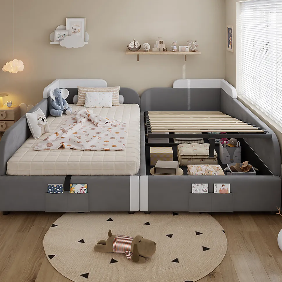 - Lit rembourré polyvalent pour enfants : ce lit combiné pour enfants allie le confort d’un lit rembourré à la praticité d’un lit pour enfants. Fabriqué en velours doux et en contreplaqué robuste de couleur grise, il dégage une chaleur et un style qui plaisent immédiatement aux enfants.
