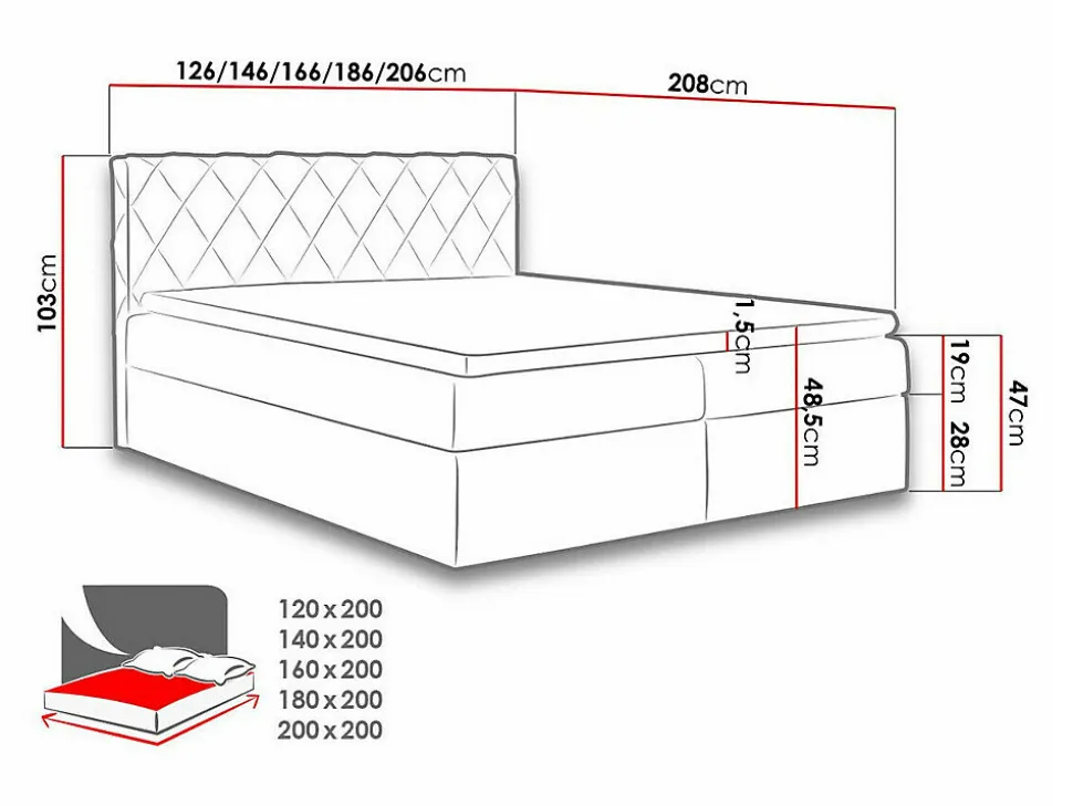 Lit continental Baltimore 127 (Velluto 3) Caractéristiques: Largeur: 146 cm; Origine: Union européenne; Sommier à lattes: Disponible; Matelas: Disponible; Boîte de literie: Disponible; Taille du matelas: 1400 x 2000 cm; Hauteur: 103 cm; Longueur: 208 cm; Poids: 109 kg; Capacité de poids maximale: 200 kg; Matériau: Tissu; Pieds: Absent; Type de matelas: Avec ressorts (Bonnell); Fermeté du matelas: Moyen; Hauteur de la zone de couchage: 47 cm; Matériau du cadre: Stratifié; Matériau du cadre: Bois; Caractéristiques du matelas: Mousse de polyuréthane; Surmatelas: Disponible; Hauteur du matelas: 19 cm; Épaisseur du surmatelas: 1.5 cm; Caractéristiques du surmatelas: Mousse de polyuréthane; Caractéristiques du surmatelas: Lavable; Caractéristiques du surmatelas: À deux côtés; Caractéristiques du surmatelas: Antiallergique; Caractéristiques du surmatelas: Antifongique; Caractéristiques du surmatelas: Respirant; Hauteur du cadre: 28 cm; Résistance: 45000 Cycles Martindale; Type de materiau: Peluche; Tête de lit: Disponible; Mécanisme de levage: Ressort; Dimensions de la boîte à literie: 25 x 197 x 67cm; Code produit: 140032