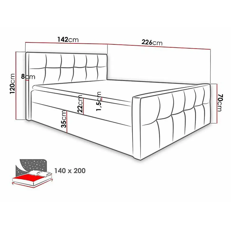 Lit continental Baltimore 138 (Soft 010) Caractéristiques: Largeur: 142 cm; Origine: Union européenne; Sommier à lattes: Disponible; Matelas: Disponible; Boîte de literie: Disponible; Taille du matelas: 1400 x 2000 cm; Hauteur: 120 cm; Longueur: 226 cm; Poids: 167 kg; Matériau: Faux cuir; Pieds: Absent; Type de matelas: Avec ressorts (Pocket); Fermeté du matelas: Moyen; Hauteur de la zone de couchage: 58.5 cm; Matériau du cadre: Stratifié; Matériau du cadre: Bois; Caractéristiques du matelas: Mousse de polyuréthane; Surmatelas: Disponible; Hauteur du matelas: 22 cm; Épaisseur du surmatelas: 1.5 cm; Caractéristiques du surmatelas: Mousse de polyuréthane; Caractéristiques du surmatelas: Lavable; Caractéristiques du surmatelas: À deux côtés; Caractéristiques du surmatelas: Antiallergique; Caractéristiques du surmatelas: Antifongique; Caractéristiques du surmatelas: Respirant; Hauteur du cadre: 35 cm; Résistance: 68000 Cycles Martindale; Tête de lit: Disponible; Mécanisme de levage: Ressort; Code produit: 211161