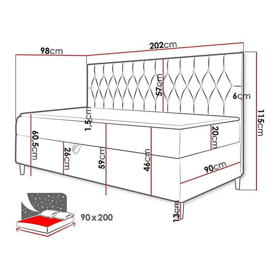 Lit continental Baltimore 166 (Soft 017 + Fresh 12) Caractéristiques: Largeur: 98 cm; Origine: Union européenne; Sommier à lattes: Disponible; Matelas: Disponible; Boîte de literie: Disponible; Taille du matelas: 900 x 2000 cm; Hauteur: 115 cm; Longueur: 202 cm; Poids: 79 kg; Matériau: Faux cuir; Matériau: Tissu; Pieds: Bois; Type de matelas: Avec ressorts (Bonnell); Fermeté du matelas: Moyen; Hauteur de la zone de couchage: 60.5 cm; Matériau du cadre: Stratifié; Matériau du cadre: Bois; Caractéristiques du matelas: Mousse polyuréthane t25; Surmatelas: Disponible; Hauteur du pied: 13 cm; Hauteur du matelas: 20 cm; Épaisseur du surmatelas: 1.5 cm; Caractéristiques du surmatelas: Lavable; Caractéristiques du surmatelas: À deux côtés; Caractéristiques du surmatelas: Antiallergique; Caractéristiques du surmatelas: Antifongique; Caractéristiques du surmatelas: Respirant; Type de materiau: Velours; Tête de lit: Disponible; Mécanisme de levage: Ressort; Dimensions de la boîte à literie: 25 x 197 x 87cm; Code produit: 469842