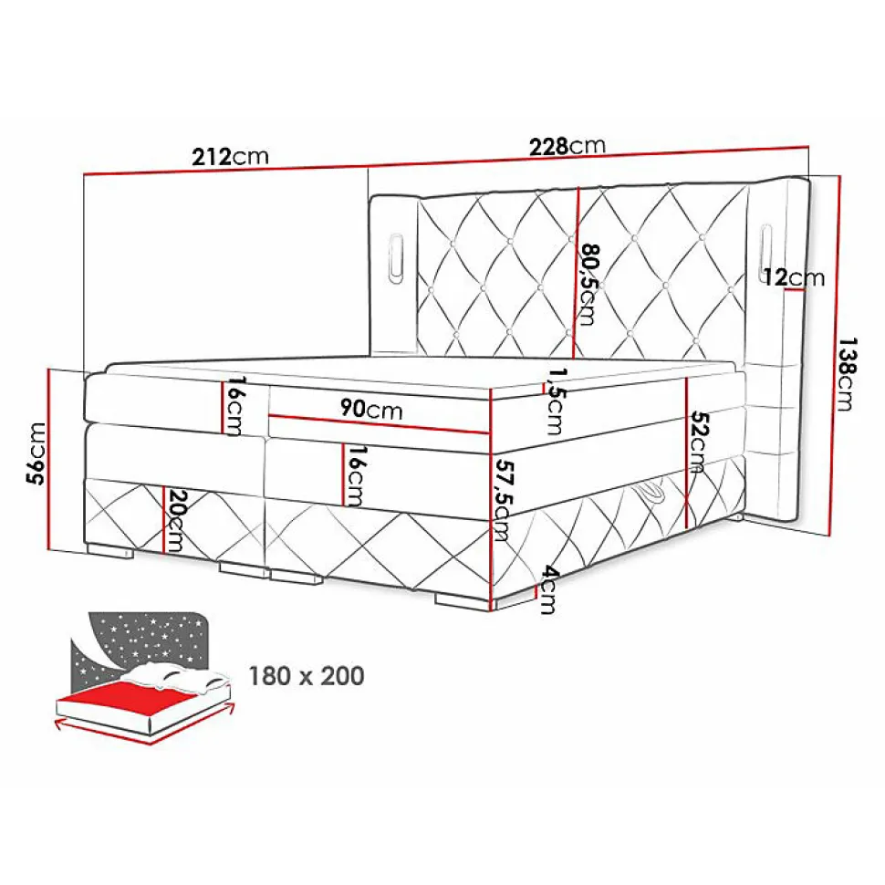 Lit continental Baltimore 187 (Kameleon 09) Caractéristiques: Largeur: 228 cm; Origine: Union européenne; Sommier à lattes: Disponible; Matelas: Disponible; Boîte de literie: Disponible; Taille du matelas: 1800 x 2000 cm; Hauteur: 138 cm; Longueur: 212 cm; Poids: 139 kg; Matériau: Tissu; Pieds: Bois; Type de matelas: Avec ressorts (Pocket); Fermeté du matelas: Moyen; Hauteur de la zone de couchage: 56 cm; LED: Disponible; Matériau du cadre: Stratifié; Matériau du cadre: Bois; Caractéristiques du matelas: Mousse polyuréthane t25; Surmatelas: Disponible; Hauteur du pied: 4 cm; Épaisseur du surmatelas: 1.5 cm; Caractéristiques du surmatelas: Mousse de polyuréthane; Caractéristiques du surmatelas: Lavable; Caractéristiques du surmatelas: À deux côtés; Caractéristiques du surmatelas: Antiallergique; Caractéristiques du surmatelas: Antifongique; Caractéristiques du surmatelas: Respirant; Type de materiau: Peluche; Dimensions de la tête de lit: 142 x 228 x 12cm; Tête de lit: Disponible; Mécanisme de levage: Ressort; Dimensions de la boîte à literie: 19 x 197 x 86cm; Bois: Pin; Code produit: 494425