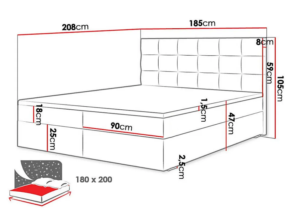 Lit continental Memphis 115 (Rico 01) Caractéristiques: Largeur: 185 cm; Origine: Union européenne; Sommier à lattes: Disponible; Matelas: Disponible; Boîte de literie: Disponible; Taille du matelas: 1800 x 2000 cm; Hauteur: 105 cm; Longueur: 208 cm; Poids: 123 kg; Matériau: Tissu; Pieds: Plastique; Type de matelas: Avec ressorts (Bonnell); Fermeté du matelas: Moyen; Hauteur de la zone de couchage: 47 cm; Matériau du cadre: Stratifié; Caractéristiques du matelas: Mousse polyuréthane t30; Surmatelas: Disponible; Hauteur du pied: 2.5 cm; Hauteur du matelas: 18 cm; Épaisseur du surmatelas: 1.5 cm; Caractéristiques du surmatelas: Lavable; Caractéristiques du surmatelas: À deux côtés; Caractéristiques du surmatelas: Antiallergique; Caractéristiques du surmatelas: Antifongique; Résistance: 75000 Cycles Martindale; Matériel supplémentaire: Bois; Dimensions de la tête de lit: 105 x 185 x 8cm; Tête de lit: Disponible; Mécanisme de levage: Ressort; Dimensions de la boîte à literie: 25 x 195 x 85cm; Bois: Pin; Code produit: 373195