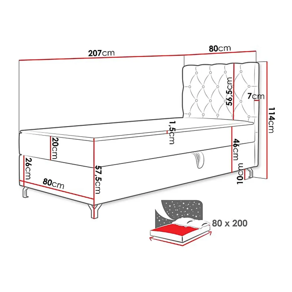 Lit continental Memphis 142 (Manila 02) Caractéristiques: Largeur: 80 cm; Origine: Union européenne; Sommier à lattes: Disponible; Matelas: Disponible; Boîte de literie: Disponible; Taille du matelas: 800 x 2000 cm; Hauteur: 114 cm; Longueur: 207 cm; Poids: 50 kg; Matériau: Tissu; Pieds: Métal; Type de matelas: Avec ressorts (Bonnell); Fermeté du matelas: Moyen; Hauteur de la zone de couchage: 57.5 cm; Matériau du cadre: Stratifié; Matériau du cadre: Bois; Caractéristiques du matelas: Mousse polyuréthane t30; Surmatelas: Disponible; Hauteur du pied: 10 cm; Épaisseur du surmatelas: 1.5 cm; Caractéristiques du surmatelas: Lavable; Caractéristiques du surmatelas: À deux côtés; Caractéristiques du surmatelas: Antiallergique; Caractéristiques du surmatelas: Antifongique; Caractéristiques du surmatelas: Respirant; Dimensions de la tête de lit: 114 x 80 x 7cm; Tête de lit: Disponible; Dimensions de la boîte à literie: 25 x 197 x 77cm; Bois: Pin; Code produit: 541199