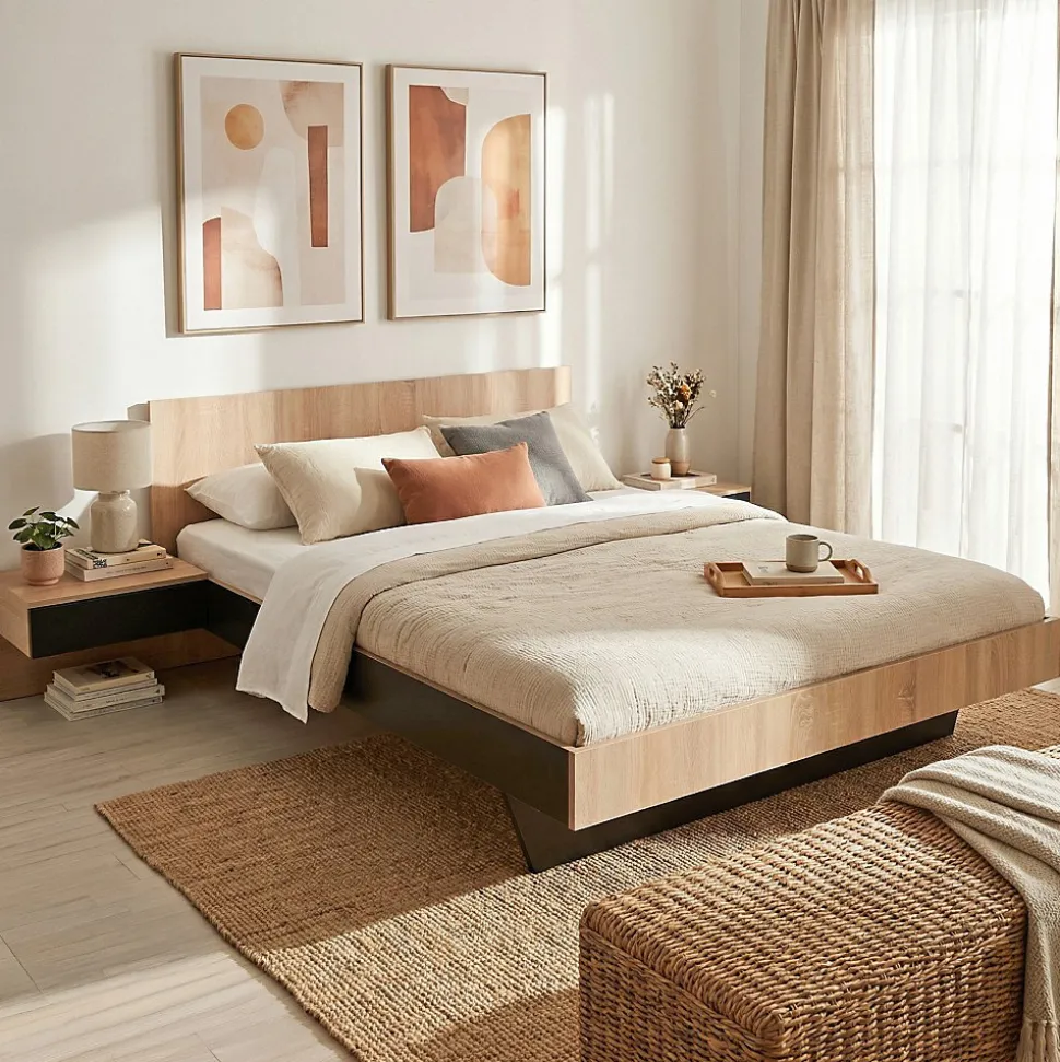 Lit COOL 140×190 cmLe lit COOL allie modernité et praticité avec ses deux chevets suspendus intégrés à la structure de lit. Astucieux, les chevets suspendus ne prennent pas de place au sol et possède chacun un tiroir. Son design bicolore apporte des notes industrielles et une ambiance loft à votre chambre à coucher.Caractéristiques : Structure en panneau de particules.12 lattes multiplis, section 70x8mm.Finition : Noir et décor chêne blanchiDimensions des chevets : 45x36x34 cmDimensions intérieures des tiroirs : 36x28x9 cmLivré démonté avec un sommier et sans matelas. A monter soi-mêmeDimensions:192x234x75 cm