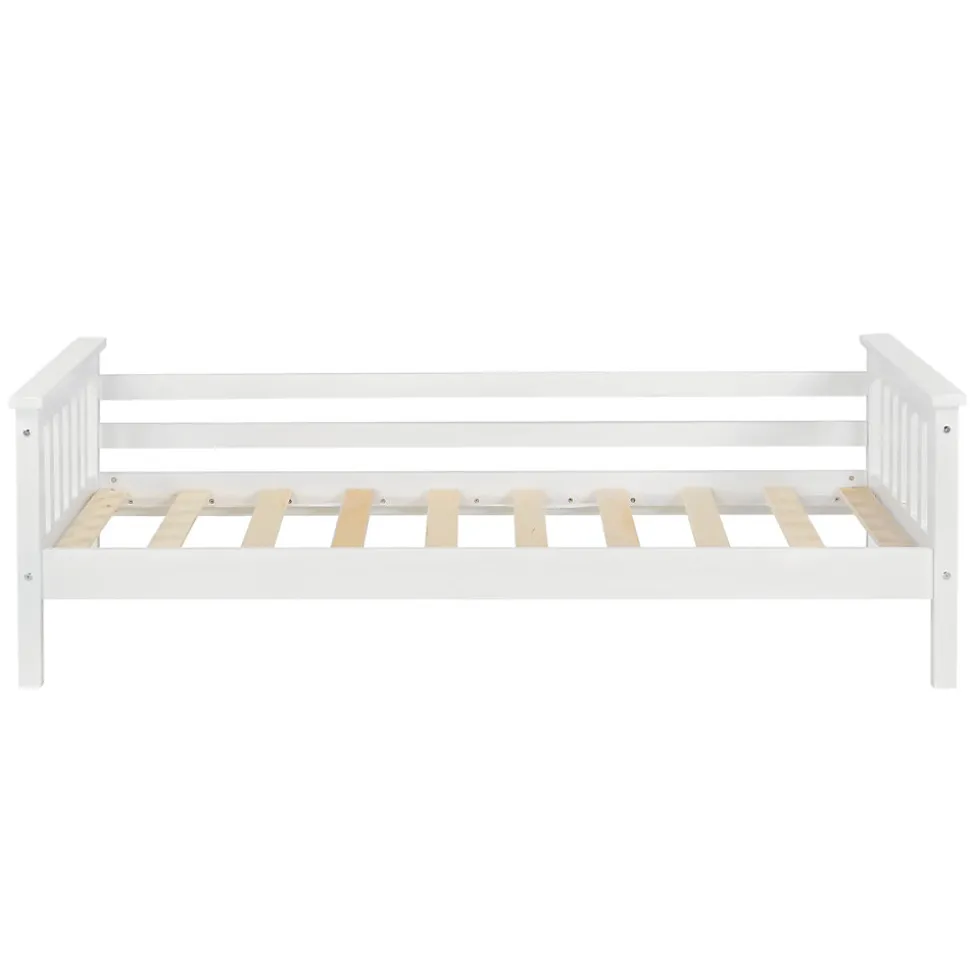 Lit d’enfantCe lit d’enfant solide en bois de pin sera l’accessoire parfait de la chambre d’enfant tout en assurant le confort pendant le sommeil pour votre enfant.Description :- avec espace de rangement sous le lit – construction robuste – assemblage facile – capacité de charge jusqu’à 70 kgDimensions :- totales (longueur x largeur x hauteur) : 168 x 90 x 52 cm – surface du couchage (longueur x largeur) : 160 x 80 cm – distance entre le sol et le bas du cadre de lit : 16 cm – distance entre le sol et le haut du cadre de lit : 25 cmMatière :- cadre de lit : bois de pin – sommier à lattes : contreplaquéCouleur :blanc mat laquéContenu de la livraison :1 x lit d’enfant 1 x sommier à lattesA noter : Le matelas, les oreillers, la couverture et les autres objets de décoration ne font pas partie de l’offre. Produit de la marque [en.casa].