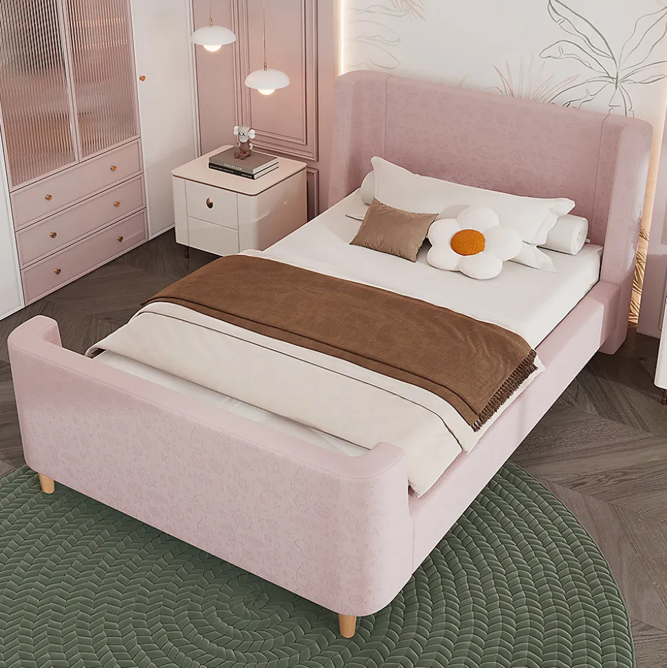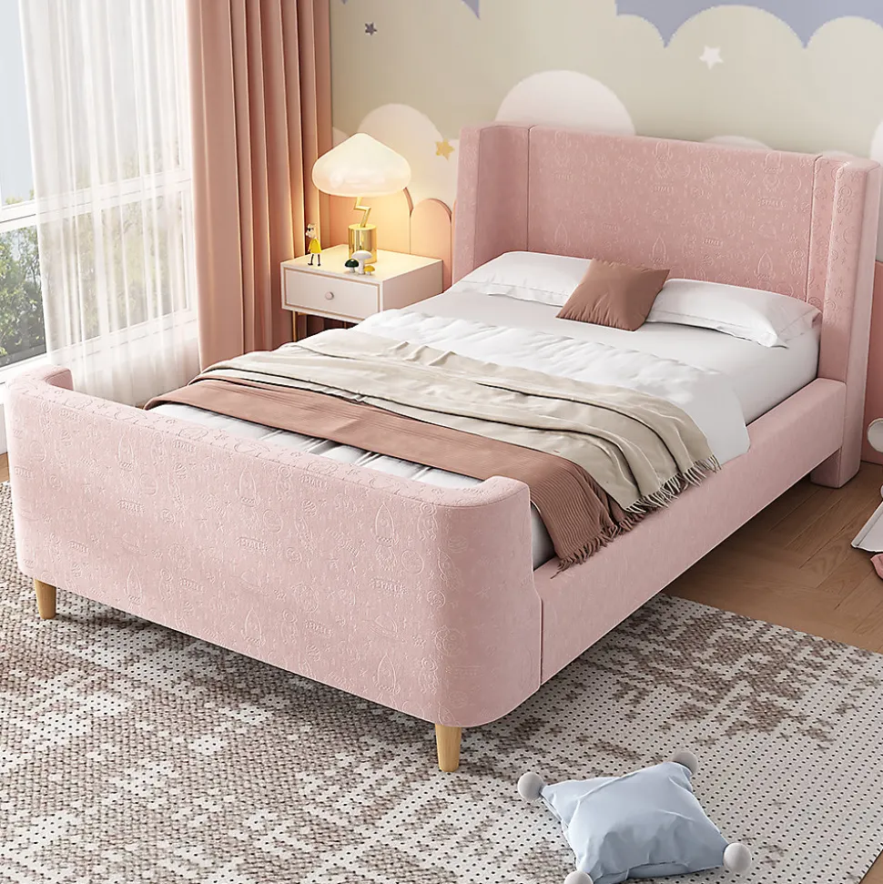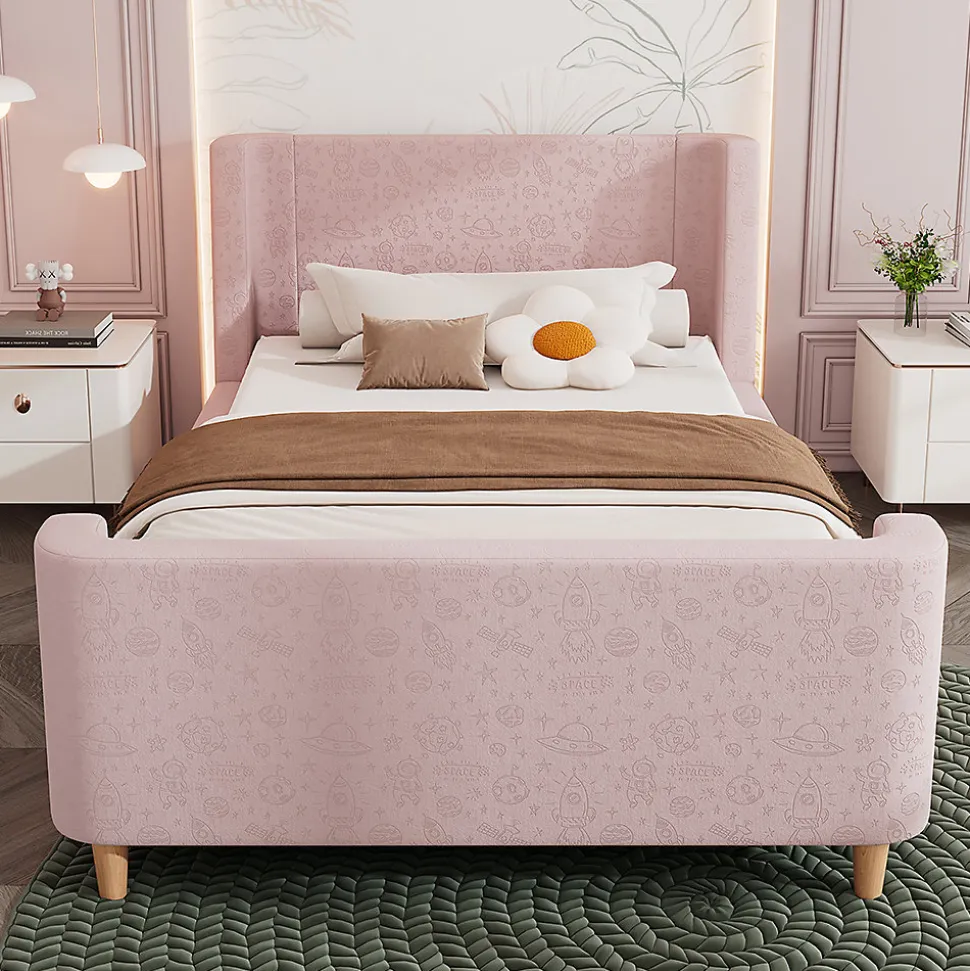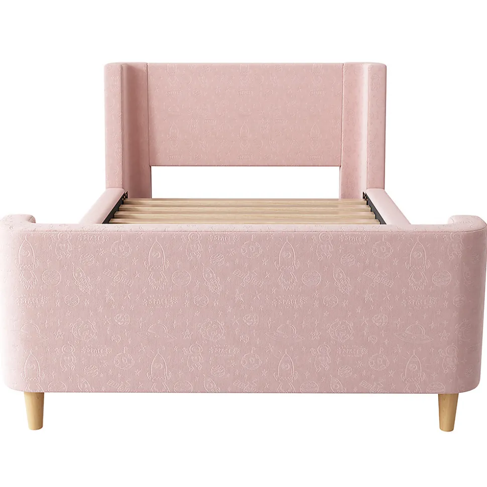 Design ludique avec motifs de dessins animés : Des motifs spatiaux soigneusement conçus stimulent l’imagination et l’esprit d’exploration des enfants. Disponible en trois couleurs : gris, blanc crème et rose. Design unique de lit traîneau : Des lignes courbées et un design esthétique créent une ambiance chaleureuse dans la chambre des enfants. Hauteur de 12 cm sous le lit pour un nettoyage facile. Matériaux confortables : Revêtement en velours doux pour la peau et tête de lit rembourrée en mousse haute densité pour une expérience de sommeil agréable. Structure solide : Lattes en bois massif avec un design encastré empêchant le glissement du matelas. Coins arrondis pour une sécurité accrue. Montage facile : Lattes avec fixation par Velcro pour une installation rapide et facile. Stabilité et sécurité assurées par des pieds antidérapants. Dimensions totales : 99 x 212 x 76 cm (L x P x H)Matériaux : Métal + velours + bois massifPoids maximum utilisateur : 150 kg / 330 lbsSommier requis : NonMontage requis : OuiContenu du colis : Tête de lit + pied de lit + sommierMatelas applicable (non inclus) : 90 x 200 cmPoids brut / poids net : 27 / 21,6 kgNombre de colis : 2