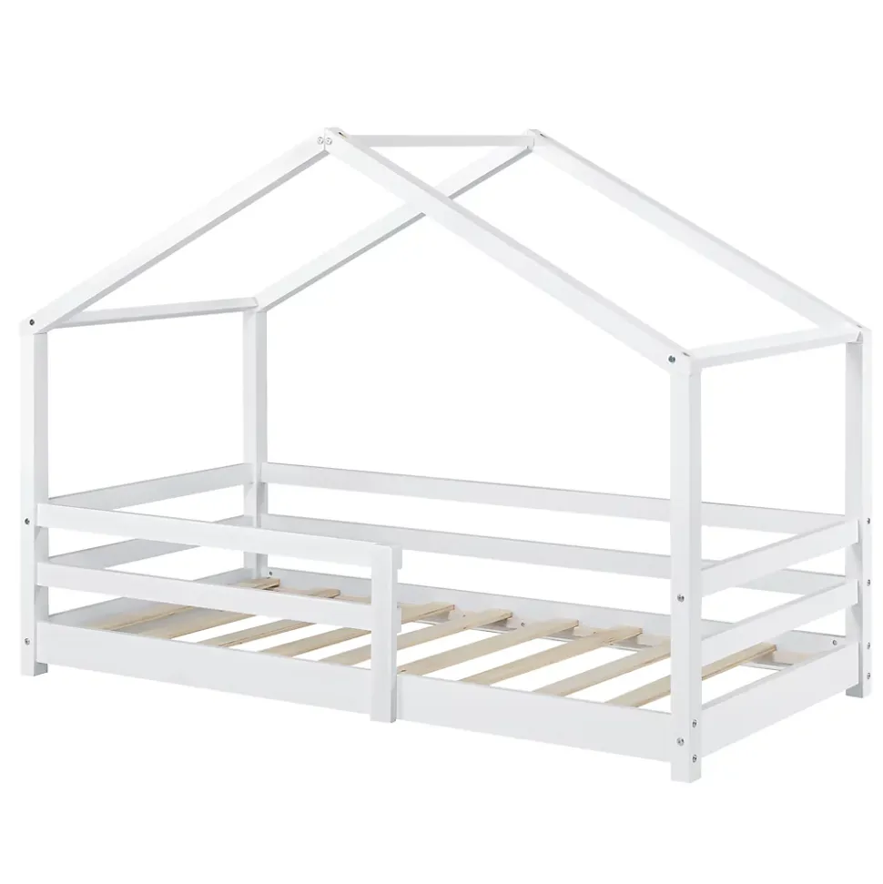 Lit d’enfant en forme maisonCe lit solide en pin est conçu aux enfants. Gâce au design maison, il peut être l’ornement de n’importe quelle chambre d’enfant. Pour assurer la sécurité de votre enfant, le matelas est encadré par des barreaux de protection.Description :- lit d’enfant – design maison – construction solide – montage facile – avec des grilles de protectionDimensions :- dimension entière (Longueur x Largeur x Hauteur) : 145 x 77 x 128 cm – dimension du matelas (Longueur x Largeur) : 140 x 70 cm – entrée de lit (Longueur x Hauteur) : 54 x 12 cm – barreaux de protection (Longueur x Hauteur) : 84 x 26 cm – distance entre le sol et la barre latérale du toit : 75 cm – barre supérieur du côté du lit : 90 cm – distance entre le sol el le dessus de la grille de protection : 38 cmMatière :pinCouleur :blanc, mat laquéContenu de la livraison :1 x lit d’enfant 1 x sommier à lattes Produit de la marque [en.casa]®