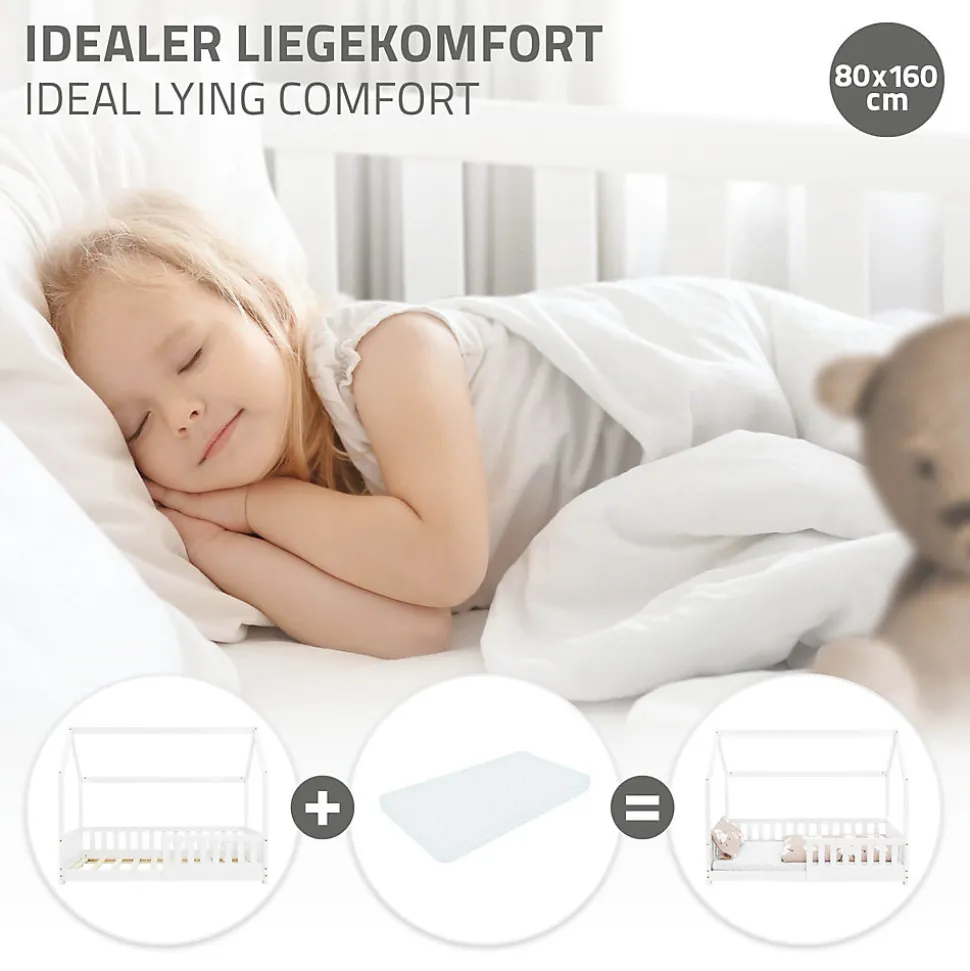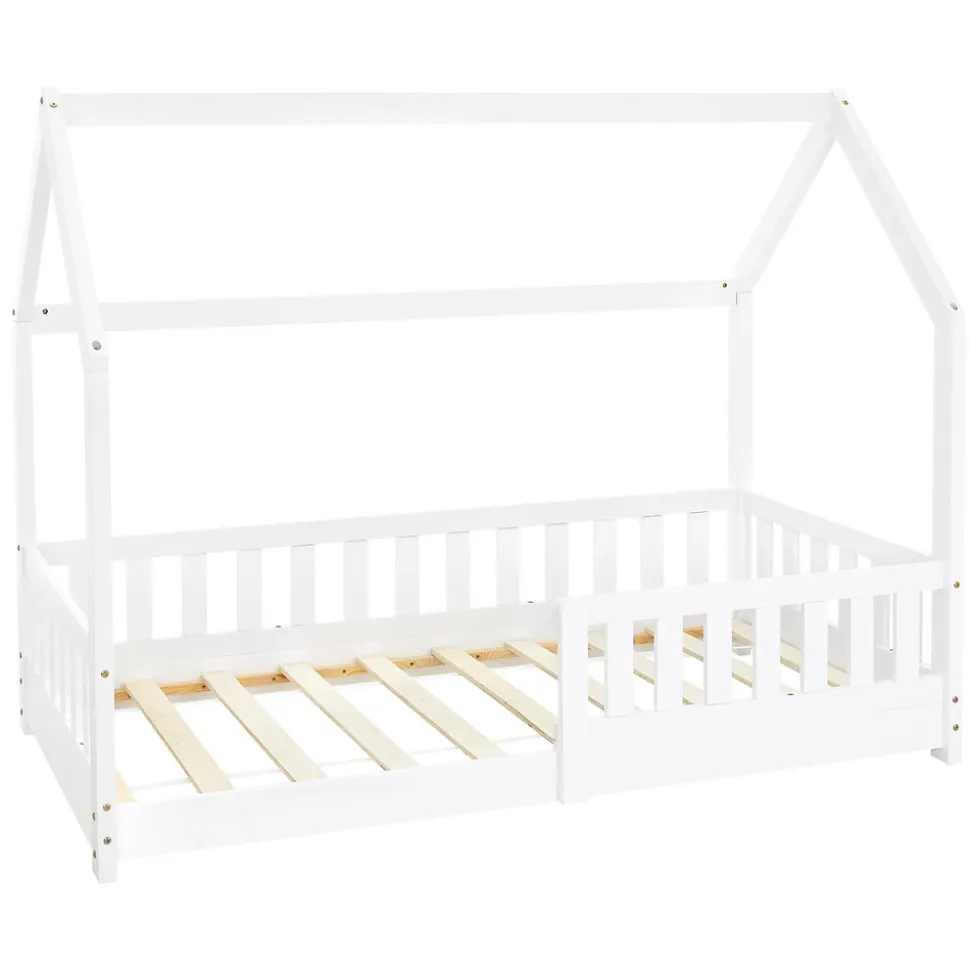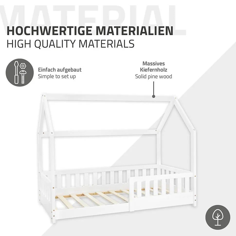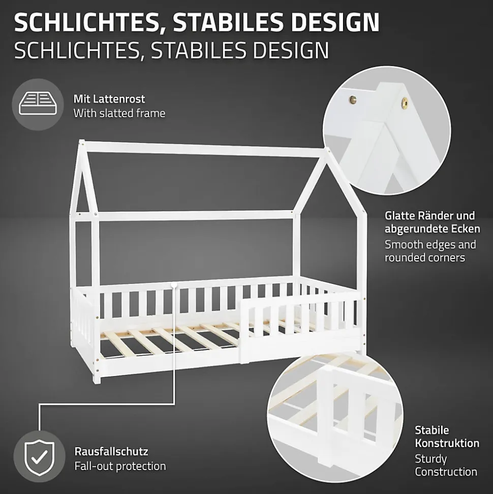 Description du produit :Le lit d’enfant moderne avec toit de ML-Design convient parfaitement comme lieu de retraite pour tes enfants. Il dispose d’une protection antichute sûre, de sorte que toi aussi, tu peux dormir en toute tranquillité la nuit.Le solide sommier à lattes peut supporter jusqu’à 120 kg. Plus d’un enfant peut donc dormir ou jouer ici.Grâce au cadre en bois stable du lit, tu peux ajouter de superbes décorations sur le toit. Tu peux par exemple y installer des guirlandes lumineuses LED, des moustiquaires, de simples rideaux ou des carillons. Ainsi, le simple cadre de lit en bois se transforme en un superbe lieu de retraite pour ton enfant.En quelques gestes, tu as monté le lit d’enfant et il est prêt à faire plaisir à ton enfant.Caractéristiques du produit :Extrêmement robusteFacile à monterPeut supporter jusqu’à 120 kgEn bois de pin naturelNombreuses possibilités d’aménagementLivraison :1 x lit d’enfant1 x sommier à lattes1 x toit1 x instructions