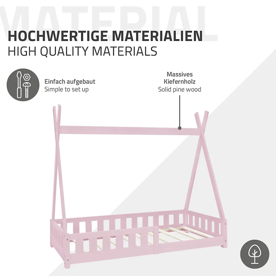 Description du produit :Ce magnifique lit d’enfant en bois de pin est le complément parfait pour la chambre d’enfant de ta progéniture. Le lit au look de tente tipi est très particulier. Le cadre est en pin massif et les entretoises reproduisent l’ossature d’une tente. Tu peux par exemple fixer des draps, des moustiquaires ou des guirlandes lumineuses sur les entretoises en bois du tipi. Tu peux ainsi transformer le cadre de lit, déjà très beau, en une véritable oasis de bien-être pour ton enfant. Pour que ta progéniture puisse également dormir en toute sécurité, le lit d’enfant dispose d’une protection contre les chutes. Le sommier à lattes peut supporter jusqu’à 100 kilos et convient également à plusieurs enfants. Sur ce lit, ton enfant peut jouer, dormir et se détendre.Caractéristiques :Aspect de la tente tipiProtection contre les chutesPeut être décoré individuellementEn bois de pin solideParfait pour la chambre d’enfantContenu de la livraison :1 x lit d’enfant TipiInstructions