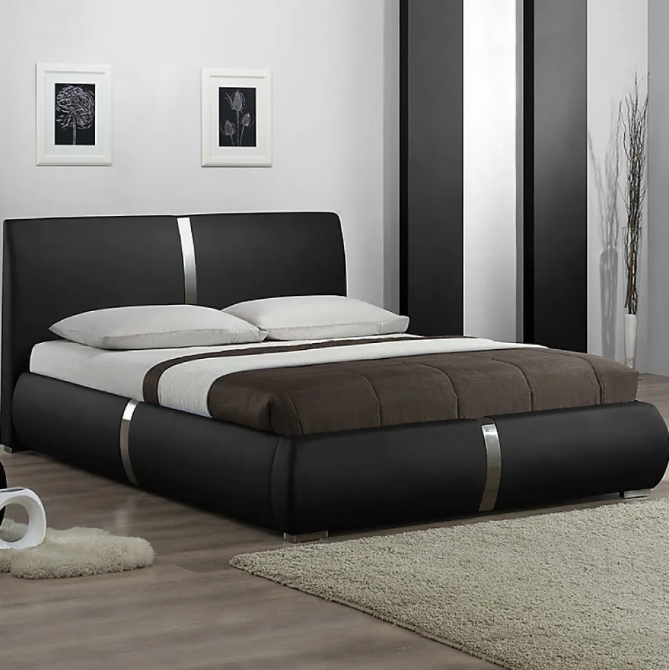 Découvrez le lit en simili noir 140 x 190 cm EDEN. Ce lit apportera dans votre chambre une touche élégante et raffinée ! Ses bandes décoratives en métal chromé son élégamment mise en avant par son revêtement en simili noir. Toutes ses finitions soignées lui donnent un aspect confortable et généreux. Existe également en 160 x 200 cm. Caractéristiques : PRODUIT : Lit en simili noir 140 x 190 cm EDEN. COULEUR : Noir. COMPOSITION : Structure en pin massif et panneaux de particules moyenne densité. Piètement et bande décoratives en métal. Revêtement simili noir 65% PU, 21% Polyester et 14% Coton. Garnissage en mousse polyuréthane 21kg/m³. Tête de lit confortable et rembourré avec finitions soignées 350gr/m². Sommier 26 lattes, 13 lattes en bois de hêtre de chaque côté, longueur : 70 cm x hauteur : 1 cm x profondeur : 6 cm, écart entre les lattes : 7 cm. DETAILS : Matelas et linges NON INCLUS. 3 pieds de soutien INCLUS pour plus de solidité. DIMENSIONS GENERALES APPROXIMATIVES : Longueur 215 cm x Hauteur 94 cm x Profondeur 151 cm. ATTENTION : La couleur de l’article peut légèrement varier par rapport au produit présenté sur la photo. ENTRETIEN : Ne pas utiliser de produits ou accessoires abrasifs. Nettoyage professionnel conseillé. LIVRAISON : Uniquement devant votre maison ou au pied de votre immeuble. Pas de livraison en étage ou d’installation. SMS DE PRISE DE RENDEZ-VOUS (1 jour plein du lundi au vendredi) ou récupération de l’article dans l’agence de livraison près de chez vous. NOMBRES DE COLIS : 3. POIDS COLIS : 47 kg. A monter soi-même.