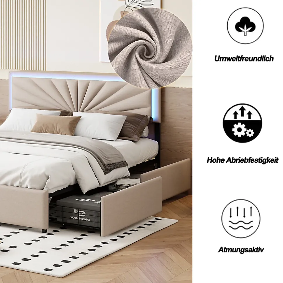 Description du produitUne tête de lit avec éclairage LED crée une atmosphère chaleureuse dans votre chambre et offre un endroit confortable pour s’appuyer pour lire et se détendre avant de se coucher. La structure solide du sommier à lattes prolonge la durée de vie de votre matelas en latex, en mousse à mémoire de forme ou à ressorts sans avoir besoin d’un lit à sommier tapissier. Sous le lit se trouvent 4 grands tiroirs push-pull qui couvrent vos besoins de rangement quotidiens et vous aident à garder la pièce bien rangée et propre. Le lit double fortuna Lai augmente votre bien-être. Détails du produit : – Matériau : lin. – Dimensions (l x p x h) : 208 x 149 x 106,5 cm. – Poids : 40 kg. – Charge maximale : 250 kg. Surface de couchage de 140 x 200 cm (sans matelas). – Nombre de lamelles : 12. Contenu de l’emballage : 1 lit. 1 mode d’emploi (français non garanti). Remarques : – Et l’ensemble du produit est livré en 2 paquets et peut arriver à des jours différents. Veuillez être patient pour la livraison complète. Les coussins, les couvertures et les objets de décoration représentés sur la photo ne sont pas inclus