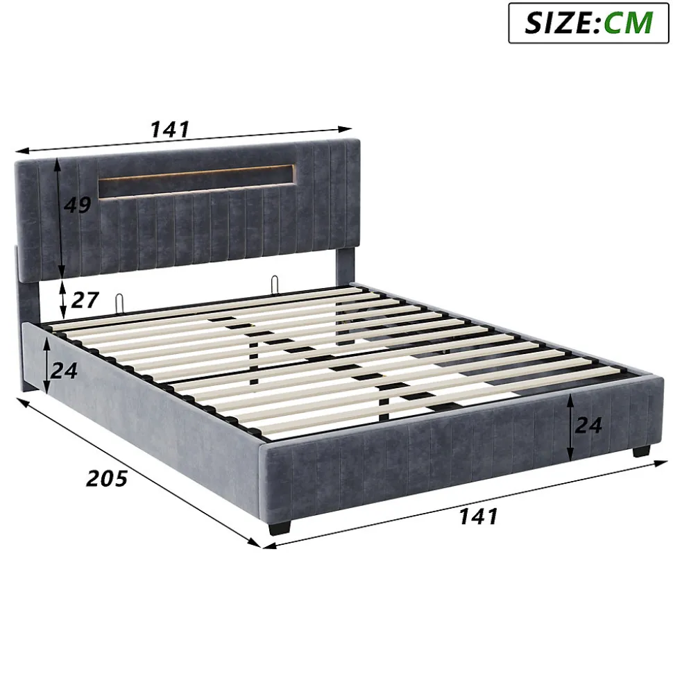 Livraison en Plusieurs Colis : En raison des grandes dimensions du lit, celui-ci sera livré en 2 colis séparés. Ne vous inquiétez pas si tous les colis n’arrivent pas en même temps.Système de levage hydraulique facile à utiliser : Grâce au mécanisme hydraulique intégré, le lit se soulève en douceur et sans effort, vous offrant un accès facile à l’espace de rangement sous le lit.Éclairage LED intégré au design moderne : La tête de lit est équipée d’une bande LED qui illumine votre chambre avec différentes couleurs, contrôlables via une application ou une télécommande.Matériaux de qualité en velours gris doux : Ce lit double est fabriqué en velours gris doux au toucher, ajoutant une touche de luxe et de confort à votre chambre à coucher.Grand espace de rangement caché : Profitez d’un lit pratique avec un coffre de rangement spacieux sous le sommier. Parfait pour stocker vos draps, couvertures ou tout autre objet encombrant.Couleur:BeigeDimensions du produit (L x l x h):205 x 141 x 112 cm; 49 kilogrammesCapacité de poids maximum:300 KilogrammesCaractéristiques:Tête de litPoids de l’article:49 Kilograms