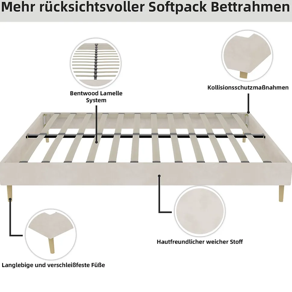 ▶ ▶ Détails ▶────────────────● Type de produit : Lit double● Dimensions du couchage : 140 × 200 cm● Couleur : Beige● Matériaux : Tissu (velours néerlandais), métal● Caractéristiques : Style moderne, base basse● Matelas et tête de lit inclus : Non● Dimensions totales du produit : 200 × 140 × 14 cm● Poids : 18 kg● Nombre de colis : 1● Montage requis : Oui● Pays d’origine : Chine► Remarques ►※ Le produit ne comprend pas les têtes de lit ni les matelas.※ Les photos du produit sont prises avec des produits réels, mais en raison de la lumière et d’autres facteurs, des variations de couleur peuvent se produire.※ Assurez-vous de mesurer l’espace avant l’achat.※ Si vous avez des questions pendant l’assemblage, n’hésitez pas à nous contacter.