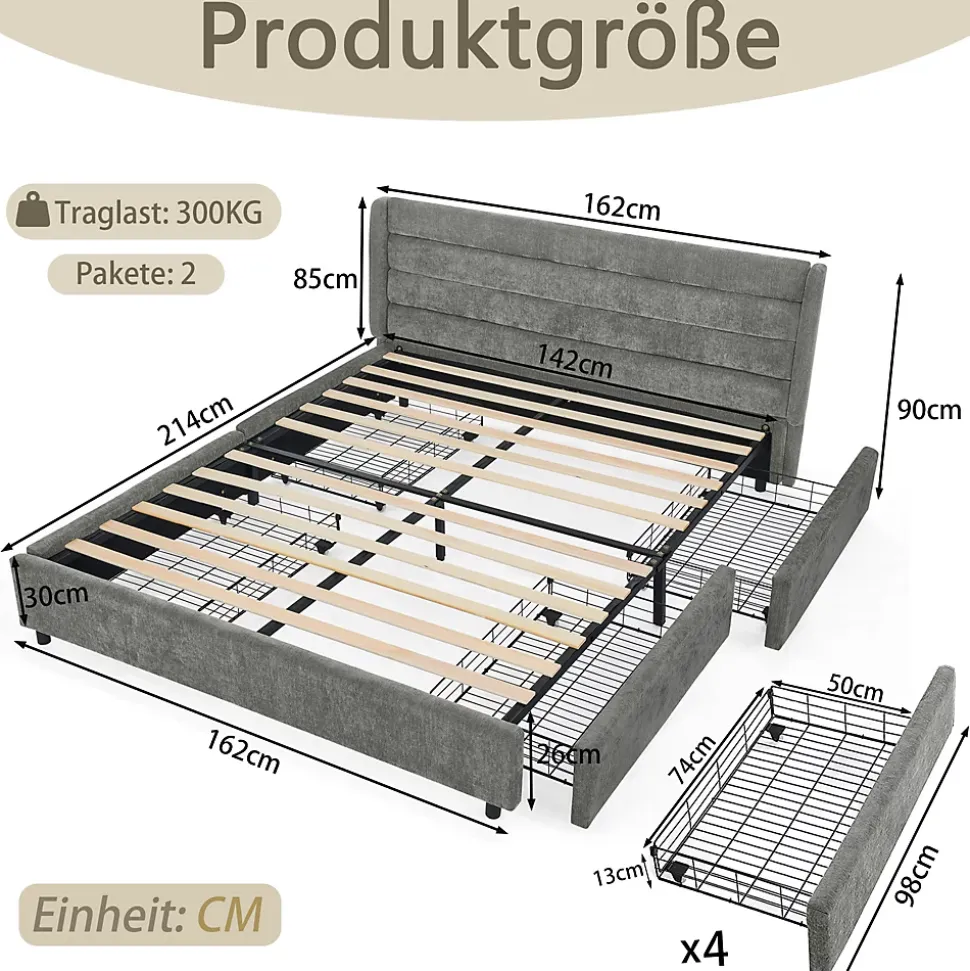 ▶ ▶ Détails ▶────────────────● Nom du produit : Lit double 140 x 200 cm (matelas non inclus)● Couleur : Gris foncé● Matériau : Eucalyptus● Rembourrage : Mousse● Utilisation : Chambre d’amis, chambre d’adolescent, appartements● Dimensions du produit : 214 x 162 x 90 cm (L x l x H)● Poids du produit : 49,00 kg● Nombre de colis : 2► Remarques ►※ En raison de mesures manuelles, un écart de 2 à 3 cm peut se produire.※ La couleur réelle du produit peut légèrement différer de celle des images en raison des conditions d’éclairage.