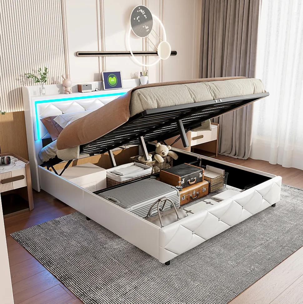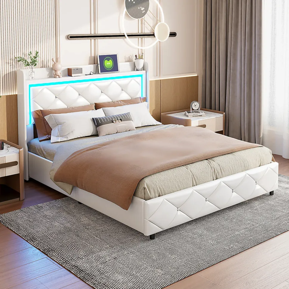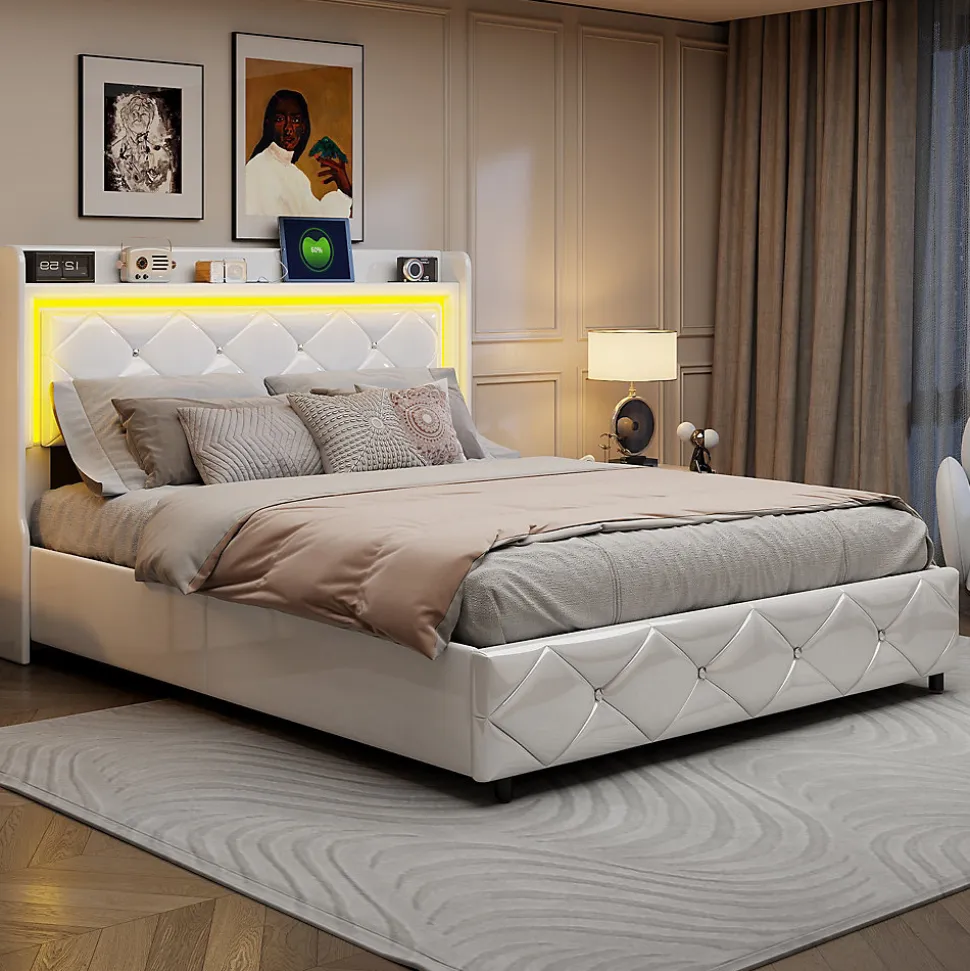 Caractéristiques du produit:1. 【Tête de lit multifonctionnelle】 : Équipée d’une lumière LED, changeable selon vos préférences avec la télécommande, ajoutant une touche de modernité à votre chambre. L’une des caractéristiques les plus utiles est la prise USB intégrée à la tête du lit, qui vous permet de recharger votre téléphone portable et votre tablette avant d’aller vous coucher 2.【Design élégant】 : Ce lit rembourré a un design à la fois classique et moderne, il s’harmonise avec différents styles d’intérieur. C’est l’ajout idéal pour votre chambre ou chambre d’amis. 3.【Structure solide】 : La robustesse de son cadre en fer, capable de supporter 340 kg, garantit sa stabilité. Les sommiers à lattes, composées de lattes en bois massif, offrent un soutien optimal pour un sommeil réparateur. 4.【Lit pratique avec rangement】 : Grâce à son système de levage hydraulique double, ce lit offre un espace de rangement considérable sous le matelas,particulièrement adapté aux petites maisons ou appartements avec un espace limité, résolvant efficacement les problèmes de place dans les petits logements. 5. 【Informations importantes】 : Pour minimiser les risques de dommage, ce lit est livré en 2/3 cartons qui peuvent arriver à des jours différents. En cas de pièces manquantes, veuillez contacter le service client.Spécifications Dimensions totales du produit : 205 x 144.5 x 114 cmMatériel: PU + MDF + métal Couleur : BlancNombre de paquets : 2 Détail des dimensions du produit : Veuillez vous référer à l’image de la taille Poids total du produit : 45 KG Capacité de poids : 340 kg Épaisseur de matelas recommandée : 20-30 cm Matelas inclus : nonNombre de lattes : 12&Remarques&※ En raison de la mesure manuelle, un écart de 2 à 3 cm peut se produire.※ En raison de l’influence de la lumière du soleil et d’autres facteurs, il peut y avoir de légères différences de couleur.