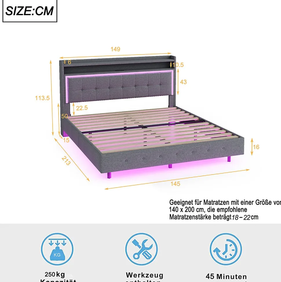 ▶ ▶ Détails ▶────────────────● Nom du produit : Lit double● Dimensions du produit : 213 x 145 x 113,5 cm● Couleur : Gris● Dimensions : 140 x 200 cm (sans matelas)● Poids total du produit : 46 kg● Capacité de charge : 250 kg● Épaisseur de matelas recommandée : 18–22 cm● Matériau du produit : Lin + Métal + Contreplaqué + MDF● Niveau de montage : Montage complet requis / Montage partiel● Poids total du colis : 48,5 kg● Nombre de lattes : 12● Temps estimé de montage : 2 heures● Nombre de personnes recommandé : 2● Outils supplémentaires nécessaires : Tous les outils inclus / Tournevis● Évitez l’utilisation d’outils électriques : Oui● Nombre de colis : 2► Remarques ►※ Ce produit sera expédié en 2 colis, qui peuvent ne pas arriver simultanément. Merci de votre patience.※ En raison de la mesure manuelle, une variation de 2 à 3 cm peut se produire.※ En raison de l’éclairage, des différences de couleur peuvent exister entre l’image du produit et le produit réel. Merci de vous référer au produit que vous recevez.※ Si vous avez des questions lors de l’installation, veuillez nous contacter dès que possible.