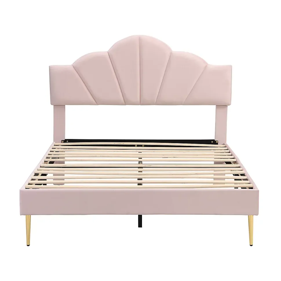 - 【Design sophistiqué】Ce lit présente une tête de lit en forme de coquille et des pieds métalliques dorés qui ajoutent élégance et raffinement, créant un point focal qui transforme l’ambiance de la chambre avec style et charme.