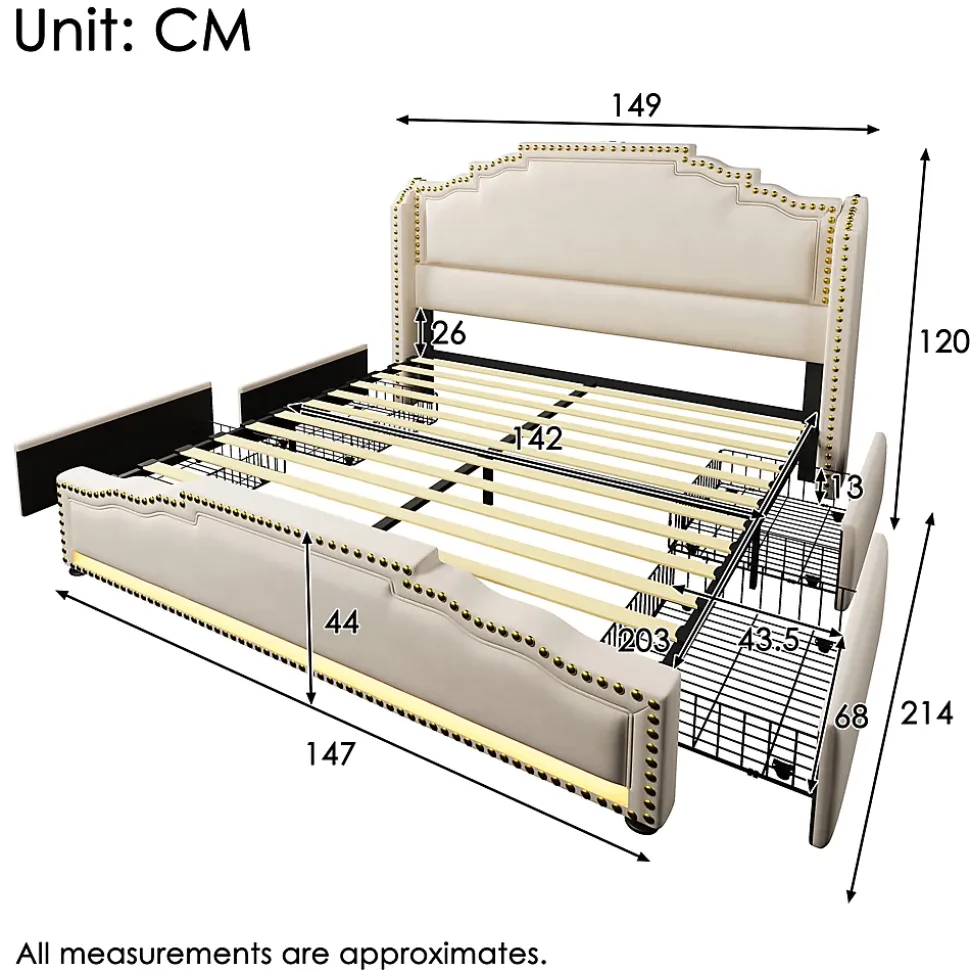 ▶ ▶ Détails ▶────────────────● Nom du produit : Lit double capitonné● Couleur : Beige● Matériau : Métal + Velours + Bois massif● Dimensions totales : 214 x 149 x 120 cm (L × l × H)● Poids brut : 57,1 kg● Poids net : 52 kg● Capacité maximale de l’utilisateur : 181 kg (400 lbs)● Montage : Nécessaire● Nombre de colis : 3● Matelas compatible : 140 x 200 cm (matelas non inclus)● Épaisseur recommandée du matelas : 26 cm● Fonctionnalités : USB + TYPE C inclus● Caractéristiques supplémentaires : Lits avec fonction de rangement et LED intégrée● Dimensions intérieures des tiroirs : 43,5 x 68 x 13 cm▶ ▶ Matelas ▶────────────────● Dimensions totales : 140 x 200 x 25 cm● Type de noyau : Matelas en mousse froide à 7 zones● Nombre de zones de confort : 7● Dureté : H3● Poids corporel maximum : 200 kg● Nombre de ressorts : 620 pcs● Positions de sommeil : Dormeur sur le ventre, sur le côté, sur le dos● Convient aux personnes allergiques : Oui, adapté aux personnes allergiques aux poussières● Régulation climatique : Excellente ventilation● Caractéristiques du matelas : Matelas réversible● Revêtement du matelas : 100 % polyester (200 g/m²)● Matériau de remplissage du revêtement : Double tissu 100 % polyester● Noyau : Ressorts ensachés + mousse ondulée● Entretien : Aucun entretien spécifique requis► Remarques ►※ Ce produit est livré en 3 colis, il est possible qu’ils n’arrivent pas simultanément. Merci de patienter.※ En raison de la mesure manuelle, un écart de 2 à 3 cm peut se produire.※ La couleur réelle peut différer légèrement de l’image en raison des conditions d’éclairage.※ La longueur est la valeur de la façade et la largeur est la valeur des côtés. La taille exacte dépend de l’image.