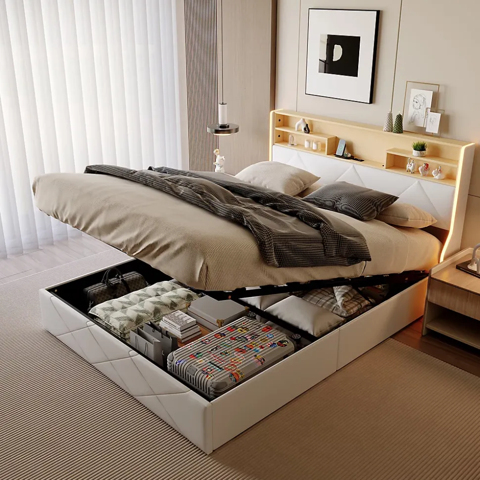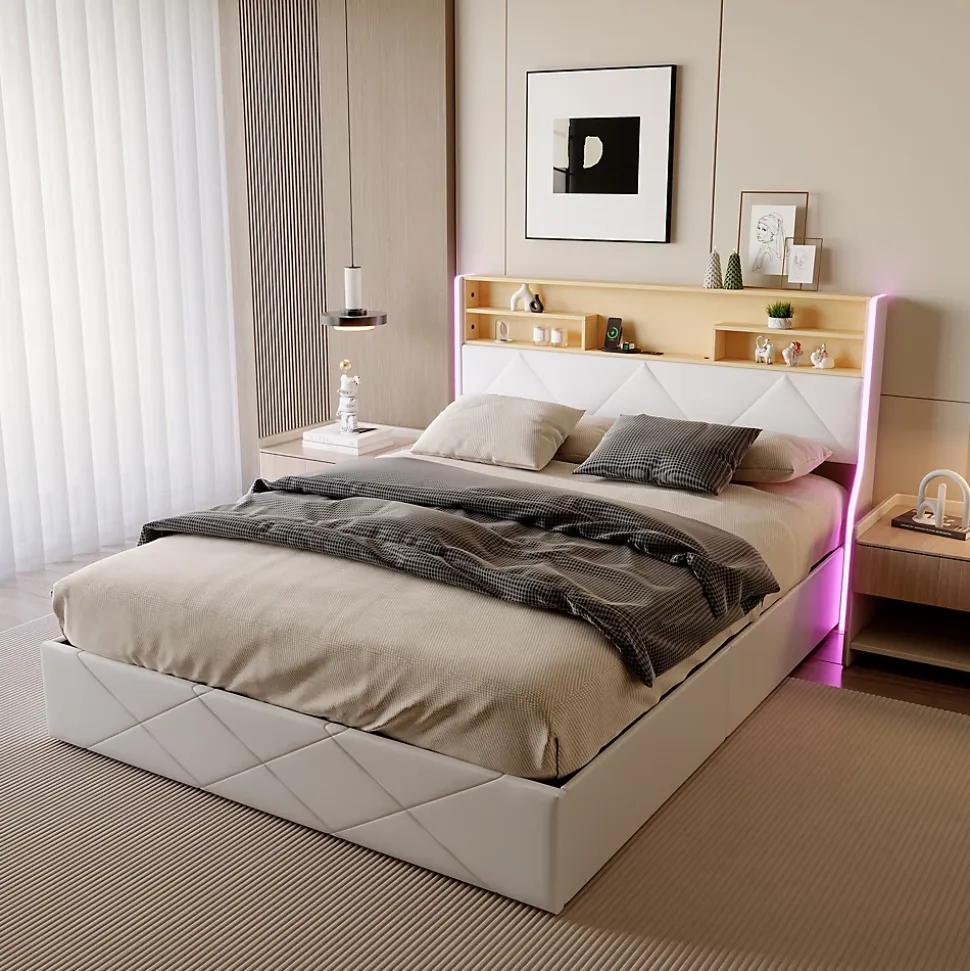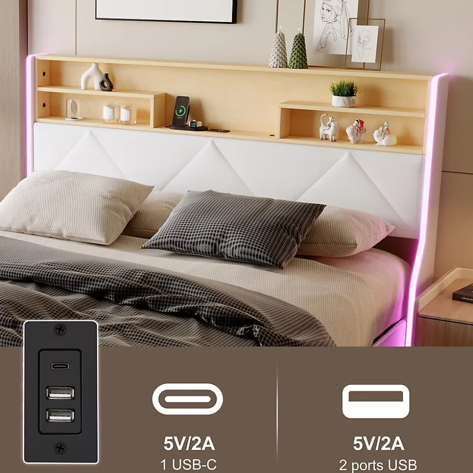 【Design moderne et élégant】 : Ce lit double en similicuir se distingue par sa tête de lit à motifs géométriques raffinés, apportant une touche de modernité et de sophistication à votre chambre. Son design sobre s’intègre parfaitement dans les intérieurs contemporains.【Grand espace de rangement 】 : Le système d’ouverture à vérin hydraulique permet d’accéder facilement à un vaste espace sous le sommier, idéal pour ranger couettes, oreillers ou autres objets volumineux. La tête de lit offre également des compartiments pratiques pour garder vos essentiels à portée de main.【Fonctionnalités modernes】 : La tête de lit est équipée d’un port USB intégré pour recharger vos appareils électroniques, tandis que les bandes LED latérales ajoutent une lumière d’ambiance douce et un effet décoratif élégant.【Durabilité et confort】 : Fabriqué à partir de matériaux de haute qualité, ce lit allie robustesse et confort. Le revêtement en similicuir est à la fois résistant, agréable au toucher et facile à entretenir, assurant une longue durée de vie au produit.【Montage facile et entretien simplifié】 : Livré avec un manuel d’instructions clair, ce lit est simple à assembler. Sa surface en cuir synthétique se nettoie aisément avec un chiffon humide, vous permettant de maintenir votre chambre propre et soignée en toute simplicité.