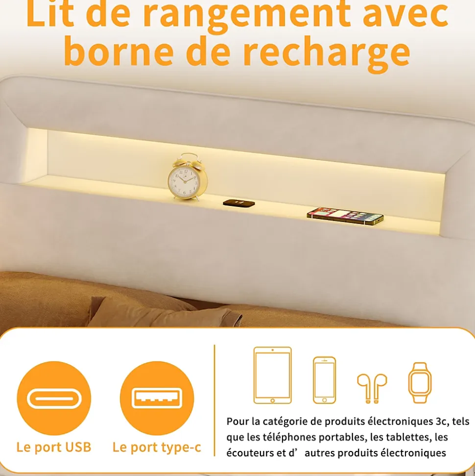 【Design moderne et élégant】 : Ce lit double en velours beige séduit par son style contemporain et raffiné. Sa tête de lit capitonnée avec éclairage LED intégré apporte une ambiance chaleureuse et personnalisable à votre chambre.【Espace de rangement optimisé】 : Doté de deux tiroirs spacieux sur roulettes au pied du lit, il offre un rangement pratique pour le linge de lit, les vêtements ou les objets du quotidien, idéal pour maximiser l’espace dans les petites chambres.【Confort supérieur】 : La tête de lit et les côtés rembourrés en velours doux procurent une sensation agréable au toucher. Le dossier légèrement incliné assure un excellent confort pour lire, regarder un film ou se détendre.【Tête de lit multifonctionnelle】 : Intègre des ports USB pour recharger facilement vos appareils électroniques, ainsi que plusieurs compartiments latéraux pour ranger vos livres, lunettes ou objets décoratifs à portée de main.【Livraison en deux colis】Pour minimiser les risques de dommages, le lit est expédié en deux colis séparés, pouvant arriver à des dates différentes. Pour toute question, notre service client est à votre disposition avec plaisir