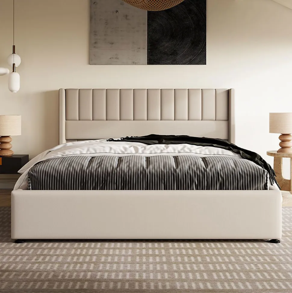 Lit double 140×200 cm avec rangement hydraulique – Lin beigeDescription : Lit double design (214,5x153x113 cm) en lin beige à rayures verticales, avec mécanisme hydraulique pour un rangement spacieux sous le lit. Tête de lit rembourrée ergonomique.Caractéristiques :Grand rangement : Coffre hydraulique facile d’accès (sangle incluse)Structure solide : Cadre métallique + lattes bois (supporte 181 kg)Confort optimal : Tête de lit rembourrée pour lecture confortableMontage simplifié : Instructions claires fourniesLivraison : 2 colis (23,8 kg + 27,23 kg) – Matelas non inclusSolution pratique et élégante pour chambre moderne
