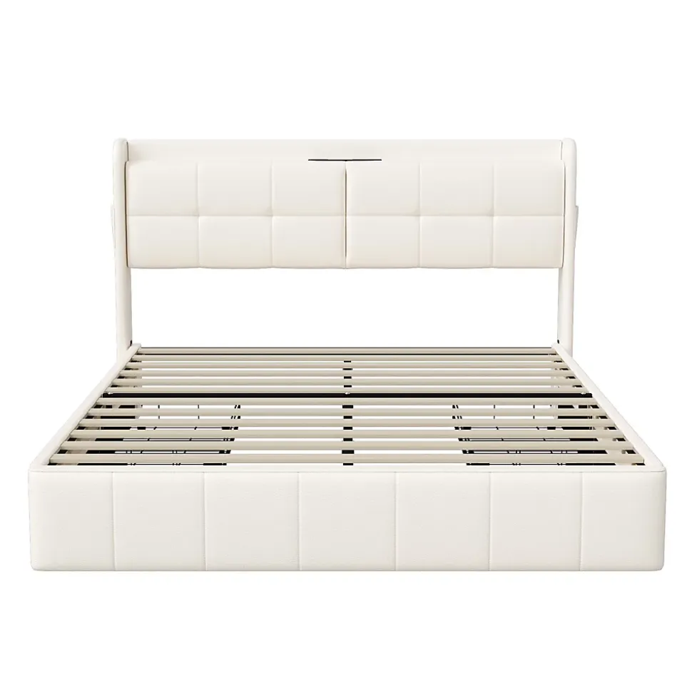 ️Station de charge USB : Ce lit combine habilement un design élégant avec un confort optimal. Le port USB intégré dans la tête de lit vous permet de charger vos appareils électroniques. Vous pouvez recharger votre téléphone et votre tablette avant de vous coucher pour les utiliser confortablement au lit.️Matériaux doux pour la peau : Le revêtement en cuir PU doux réduit efficacement les risques de blessure dus aux coins ou bords pointus, offrant une intégration parfaite dans votre chambre. Ce style chic et épuré reflète votre quête de qualité de vie.️Espace de rangement : Sous le sommier à ressorts se trouvent quatre grands tiroirs intégrés, parfaits pour ranger draps, couvertures, oreillers, vêtements, et chaussures. Les roulettes sous les tiroirs permettent une ouverture et fermeture aisées, rendant votre espace plus ordonné.️Stable et durable : La structure interne en acier et le matériau PU garantissent une douceur et une durabilité optimales. Le cadre métallique croisé peut supporter jusqu’à 300 kg, assurant un soutien solide et fiable. Cette construction assure la durabilité et la stabilité du lit.️Deux colis : Pour minimiser le risque de dommages, le lit est expédié en deux colis, qui peuvent arriver à des dates différentes. Lit double rembourré, espace de rangement, tête de lit, avec charge USB.Remarques : En raison de mesures manuelles, une erreur de 2 à 3 cm peut se produire. Ce produit sera livré en 2 colis. Ils peuvent ne pas arriver en même temps. Veuillez patienter. Si le client a des questions pendant l’installation, veuillez nous contacter dès que possible.DescriptionMatériau : Bois massif + PU + MétalCouleur : BlancNombre de colis : 2Assemblage requis : ouiDimensions du produit : 208.5 x 166 x 106 cmDimensions du lit : 160 x 200 cm (sans matelas)Poids du produit : 47 kgCharge maximale du lit : 300 kg