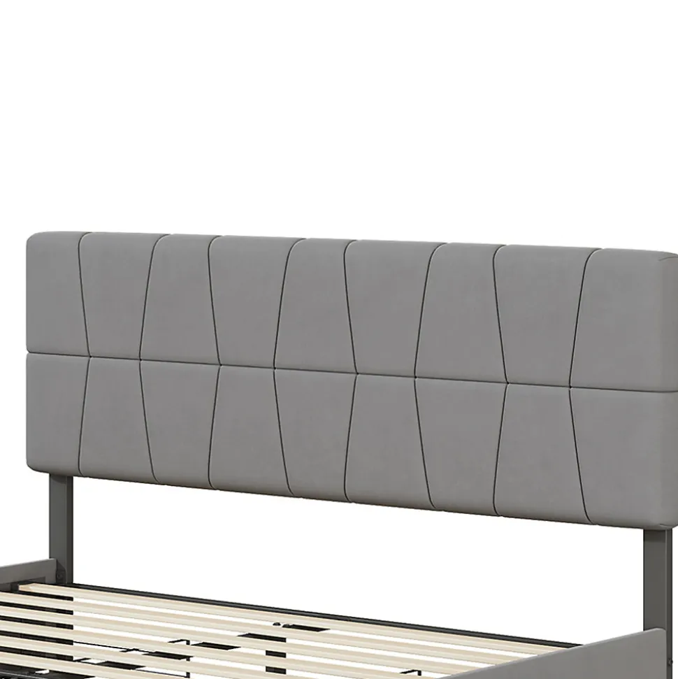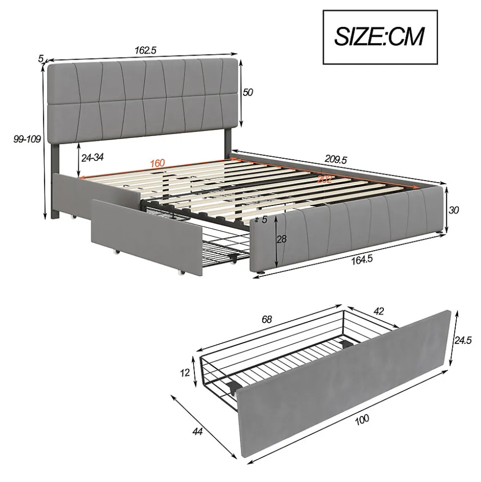 Description du produit Ce lit double présente un design moderne et épuré, alliant fonctionnalité et esthétique. Son sommier à lattes robuste assure un bon soutien et une bonne respirabilité du matelas, créant ainsi une base solide pour un sommeil réparateur. La tête de lit unique est non seulement réglable en hauteur pour s’adapter à différentes morphologies, mais elle est également recouverte d’un fin velours gris doux au toucher qui crée une atmosphère subtile et luxueuse. Quatre tiroirs sont astucieusement intégrés sous le pied du lit et offrent un espace de rangement supplémentaire. Qu’il s’agisse de linge de lit saisonnier, de vêtements ou d’effets personnels, ils peuvent être rangés avec soin et assurent une chambre plus organisée. Le design global privilégie le confort et la fonctionnalité. C’est le choix idéal pour ceux qui apprécient la qualité de vie et veulent donner à leur chambre paix et élégance. Détails du produit : – Matériaux : Bois + Métal + Velours – Dimensions (L x P x H) : 209,5 x 164,5 x 99-109 cm. – Poids total du produit : 48,1 kg – Charge maximale : 250 kg. Surface de couchage : 160 x 200 cm (sans matelas). – Couleur : Gris – Type de cadre de lit : Sommier à lattes inclus. Niveau d’assemblage : Assemblage complet requis / Assemblage partiel. – Outils supplémentaires requis : Tous les outils inclus / Tournevis. La livraison comprend : 1 x lit double. 1 x Manuel d’instructions (éventuellement non en allemand). Remarques : 1. De légères différences de dimensions sont possibles en raison de la mesure manuelle. 2. Pour des raisons logistiques, l’heure de livraison des deux colis peut être différente. Merci de votre compréhension.
