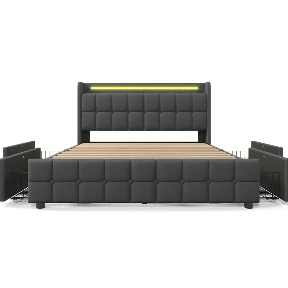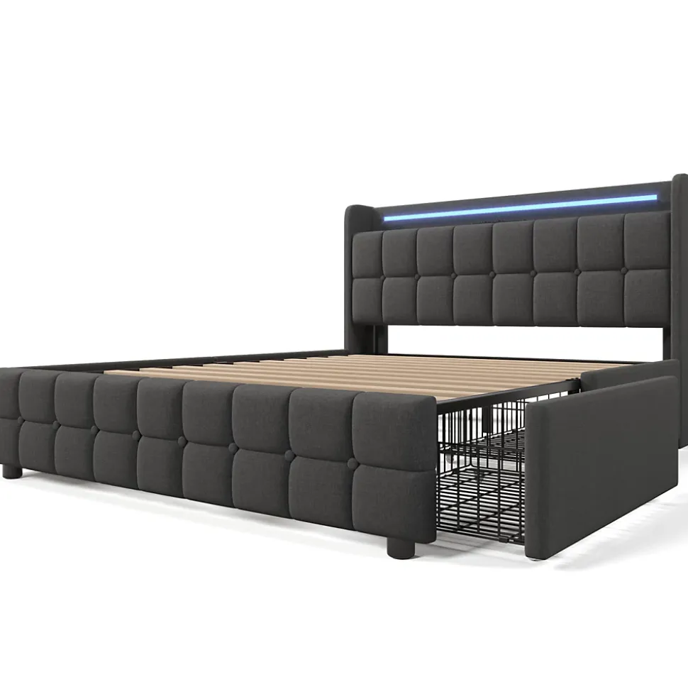 【Tête de lit avec prises de courant et ports USB】l’une des caractéristiques les plus pratiques de ce lit est la prise de courant intégrée à la tête de lit, qui vous permet de charger votre téléphone et votre tablette avant de vous coucher. Chaque prise de courant dispose de deux ports de charge standard de l’UE et de deux ports USB.【Éclairage LED 】L’éclairage LED ajoute une touche de modernité à votre chambre à coucher. Avec la télécommande, vous pouvez choisir parmi différentes couleurs et intensités lumineuses pour vous détendre en toute commodité.【Design de rangement 】Ce lit est équipé de 4 grands tiroirs de rangement. Les côtés du lit sont munis de fermoirs de tiroir, permettant de fixer solidement le tiroir au lit lorsqu’il n’est pas utilisé, pour garder votre chambre bien rangée. Les boîtes de rangement sont faciles à faire glisser grâce aux roulettes situées au bas.【Praticité et design】 Ce lit allie design élégant et confort ultime. Les boutons décoratifs ajoutent une touche moderne à la tête de lit. La structure du lit est principalement en fer, durable et capable de supporter jusqu’à 600 livres. Les pieds de support supplémentaires de la barre centrale garantissent une stabilité fiable du lit.Spécifications du produit :Dimensions totales : 164,5x220x103,5 (LxLxH)Matelas applicable (matelas non inclus) : 160×200 CMDimensions intérieures des tiroirs : 74,5×49,5×15 (LxLxH)Espace de tête de lit : 25cmPoids maximal de l’utilisateur : 600 LBSNombre de colis : 2Assemblage requis : OuiDétails du produit :Type de produit : lit capitonné + tiroir, avec fonction de charge + fonction d’éclairage LEDMatériau de la plaque : Matériau en linCouleur : Beige / GrisType de charge : 2 USB + 2 prisesContenu de l’emballage : Cadre de lit + Prises + Tiroirs*4Design unique : Fonction de chargement + Éclairage LED