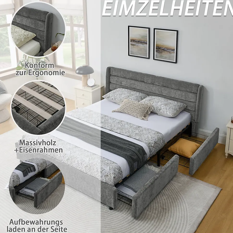 - 【Optimisation de l’espace】 Le design intelligent avec tiroirs sous le lit libère de l’espace au sol, permettant d’aménager efficacement la chambre tout en offrant un couchage confortable et spacieux pour deux personnes.