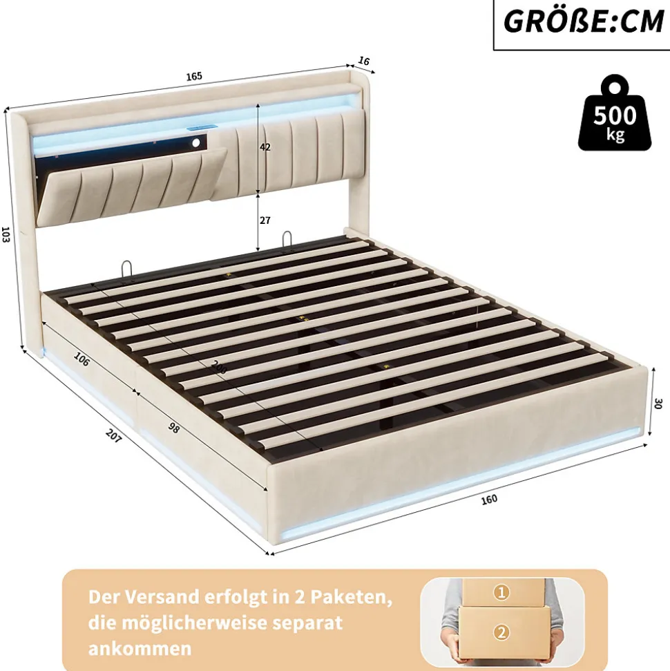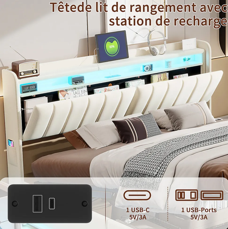 Recharge pratique au litTête de lit équipée d’un port USB et d’un port Type-C, idéal pour recharger smartphone, tablette et appareils électroniques sans quitter le lit. Éclairage LED RGB intelligentBande LED RGB intégrée avec télécommande + contrôle via application mobile, offrant plusieurs modes d’ambiance pour créer un espace chaleureux et moderne. Grand espace de rangement4 tiroirs métalliques coulissants sous le cadre du lit pour optimiser l’espace — parfait pour organiser linge de lit, vêtements, jouets ou couvertures. Tête de lit avec étagère intégréeEspace de rangement pratique sur la tête de lit pour poser livres, réveil, téléphone ou objets décoratifs — tout à portée de main. Élégance et confort en veloursRevêtement en tissu velours doux et raffiné dans un ton beige moderne, apportant chaleur, style et confort à la chambre adulte ou adolescente.