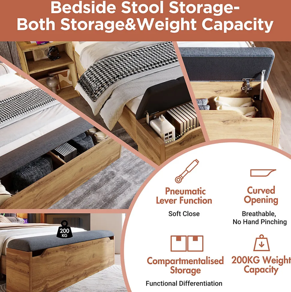 - 【Banquette avec rangement intégré】 La banquette située au pied du lit s’ouvre facilement grâce à un système assisté et révèle plusieurs compartiments internes, idéals pour organiser linge ou objets peu utilisés sans désordre visible.