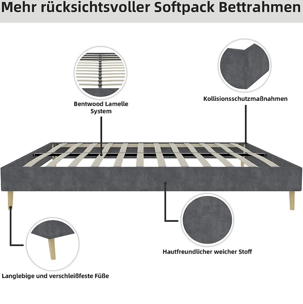 ▶ ▶ Détails ▶────────────────● Type de produit : Lit double● Matériau : Tissu (velours néerlandais) + Métal● Couleur : Gris● Dimensions du produit : 200 × 160 × 14 cm (L × l × H)● Poids du produit : 19,00 kg● Nombre de colis : 1● Type : Cadre de lit (sans vérin à gaz, tête de lit ni matelas)● Remplissage : Mousse à mémoire de forme● Matériau du cadre : Matériau composite● Vérin à gaz : Non inclus► Remarques ►※ Toutes les dimensions sont approximatives.※ En raison des conditions d’éclairage, des variations de couleur peuvent exister entre les images du produit et le produit réel.