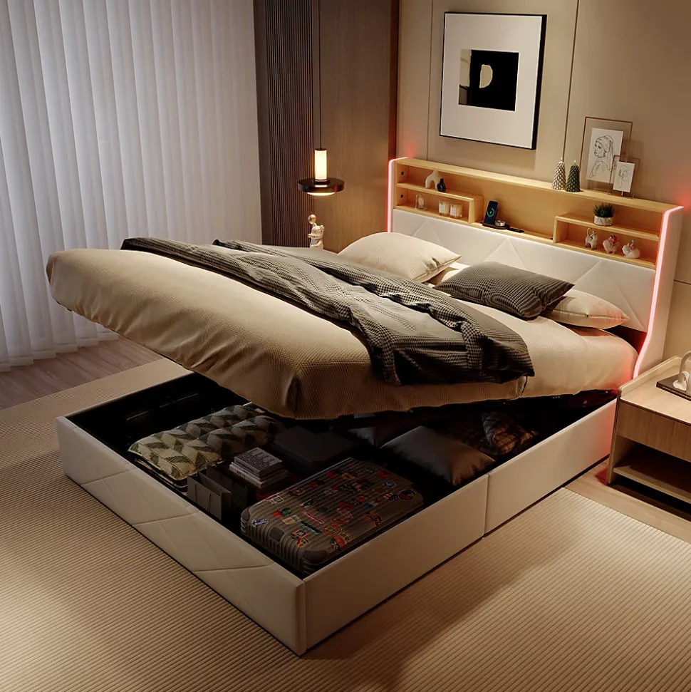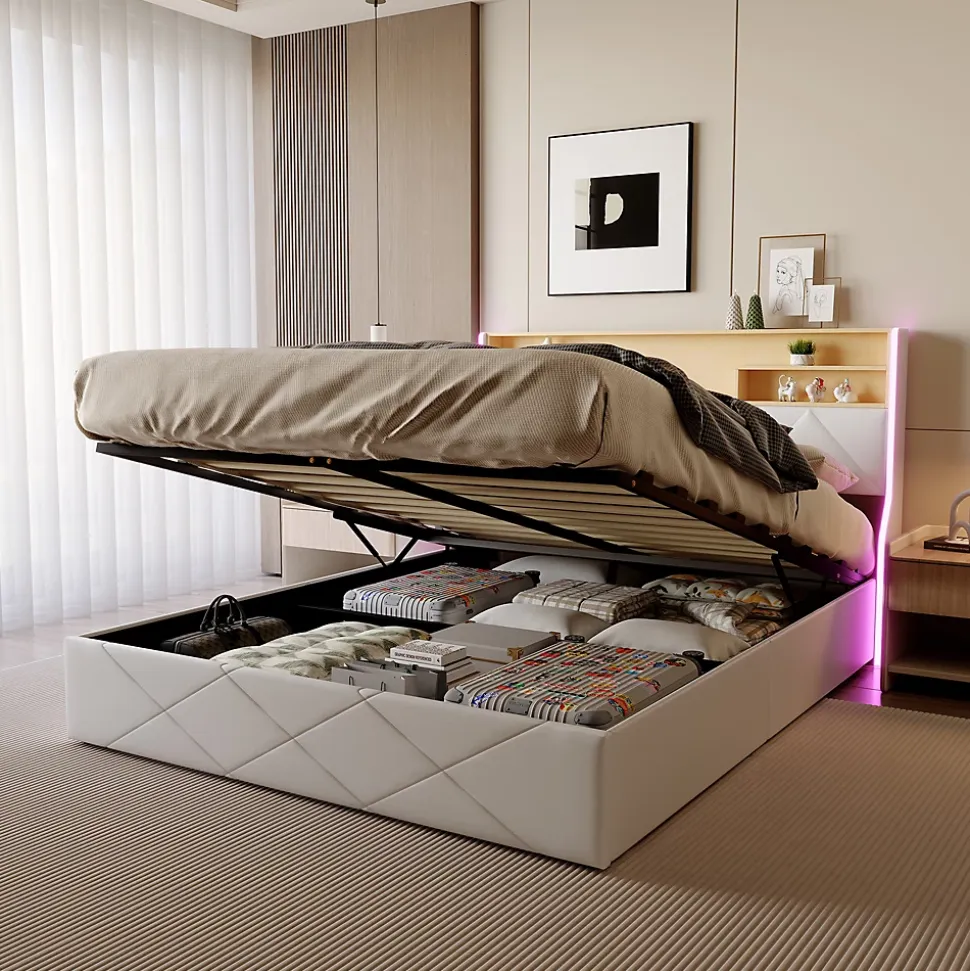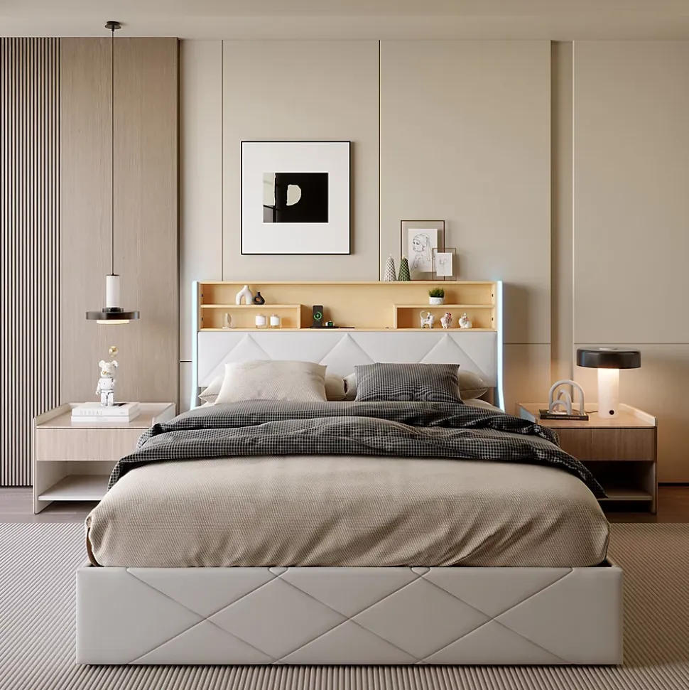 【Design moderne et élégant】 : Ce lit double en similicuir se distingue par sa tête de lit à motifs géométriques raffinés, apportant une touche de modernité et de sophistication à votre chambre. Son design sobre s’intègre parfaitement dans les intérieurs contemporains.【Grand espace de rangement 】 : Le système d’ouverture à vérin hydraulique permet d’accéder facilement à un vaste espace sous le sommier, idéal pour ranger couettes, oreillers ou autres objets volumineux. La tête de lit offre également des compartiments pratiques pour garder vos essentiels à portée de main.【Fonctionnalités modernes】 : La tête de lit est équipée d’un port USB intégré pour recharger vos appareils électroniques, tandis que les bandes LED latérales ajoutent une lumière d’ambiance douce et un effet décoratif élégant.【Durabilité et confort】 : Fabriqué à partir de matériaux de haute qualité, ce lit allie robustesse et confort. Le revêtement en similicuir est à la fois résistant, agréable au toucher et facile à entretenir, assurant une longue durée de vie au produit.【Montage facile et entretien simplifié】 : Livré avec un manuel d’instructions clair, ce lit est simple à assembler. Sa surface en cuir synthétique se nettoie aisément avec un chiffon humide, vous permettant de maintenir votre chambre propre et soignée en toute simplicité.