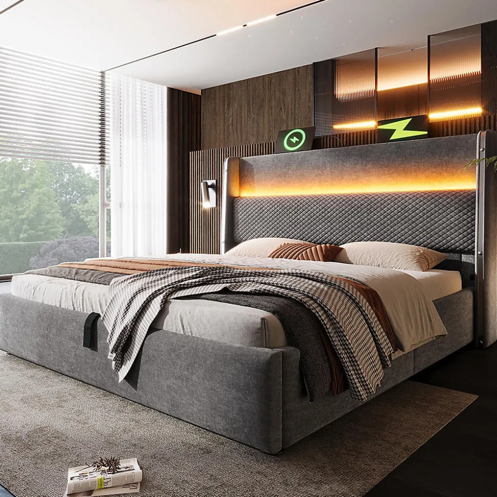 - 【Éclairage LED et ports de chargement】 Une bande lumineuse LED intégrée à la tête de lit, contrôlable à l’aide de boutons, d’une application ou d’une télécommande, offre plus de 60 000 options de couleurs, une minuterie et plusieurs modes d’éclairage dynamiques, créant ainsi une atmosphère romantique. Une station de recharge pratique située sur la tête de lit offre des options de recharge USB et Type-C pour les smartphones, tablettes et autres appareils, garantissant ainsi une expérience utilisateur plus intelligente et plus confortable.