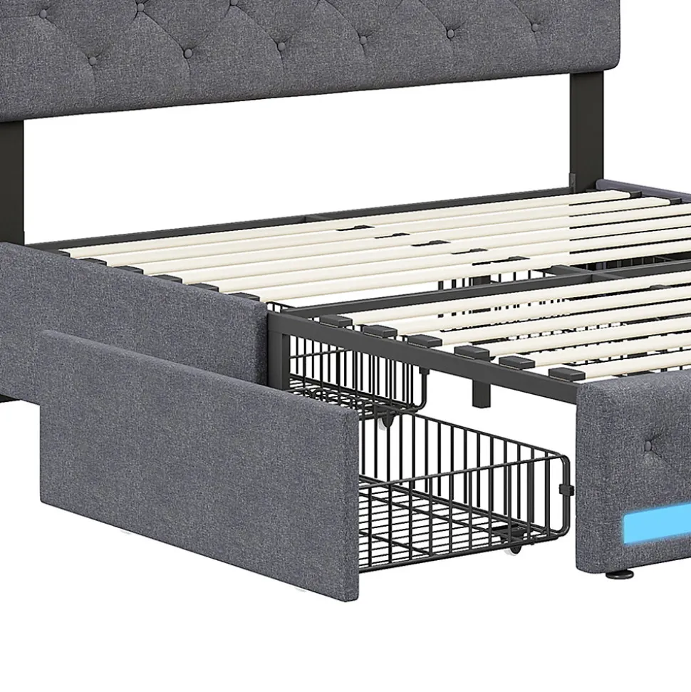 ✦ Description du produit•【Éclairage LED】 : La tête de lit est équipée de LED avec télécommande permettant de régler couleurs, luminosité et vitesses, créant une ambiance unique et moderne dans la chambre.•【Station de chargement USB】 : Ports USB et Type-C intégrés à la tête de lit pour charger facilement téléphones et tablettes, offrant un confort pratique pour la vie quotidienne.•【Rangement spacieux】 : Quatre tiroirs de grande capacité sous le lit offrent suffisamment d’espace pour les vêtements, literie et objets divers, aidant à maintenir la chambre bien rangée.•【Tête de lit ajustable】 : La tête de lit rembourrée géométrique permet un réglage en hauteur selon la morphologie de l’utilisateur, assurant confort et ergonomie optimaux.•【Structure robuste et durable】 : Cadre en fer solide avec pieds de support supplémentaires, capacité de charge jusqu’à 360 kg (793 lb). Les boutons décoratifs ajoutent style et élégance à l’ensemble du lit.✦ Détails du produit :- Matériau : Lin + bois + métal.- Dimensions (l x L x H) : 210x186x108 cm.- Matelas applicable (matelas non inclus) : 180×200 cm.- Hauteur de la tête de lit : 96/102/108 cm- Type de charge : USB + Type – C- Sommier tapissier nécessaire: aucun- Poids : 50 kg.- Poids maximal supporté : 360 kg.- Design unique : fonction de charge- Nombre de lamelles : 12.✦ Remarques :- Et tout le produit est livré en 2 paquets et peut arriver à des jours différents. Veuillez être patient pour la livraison complète.- Les coussins, couvertures et objets de décoration présentés sur l’image ne sont pas inclus- Si vous devez déplacer le lit, soulevez-le au lieu de le faire glisser sur le sol pour protéger le cadre du lit et le sol.
