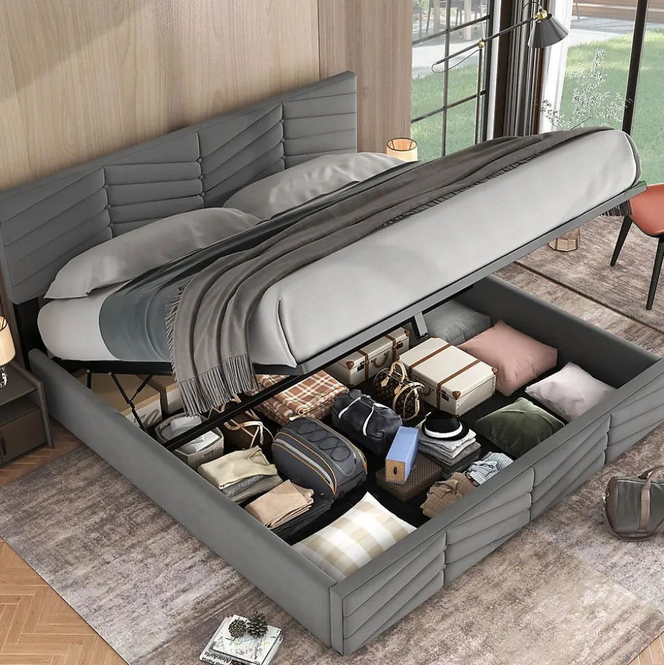 Lit double hydraulique 180×200 cm – Gris veloursDimensions: 205.5(L) x 182(P) x 90-95(H) cm Capacité: 300 kg Matériau: Velours haut de gammeCaractéristiques: ✔ Tête de lit réglable (5 cm d’ajustement) ✔ Rangement hydraulique sous le lit ✔ Design rayé avec boutons décoratifs ✔ Sommier à lattes inclusLivraison: 2 colis:197x32x15 cm (30 kg)187x46x10 cm (23 kg)Montage: Notice incluse