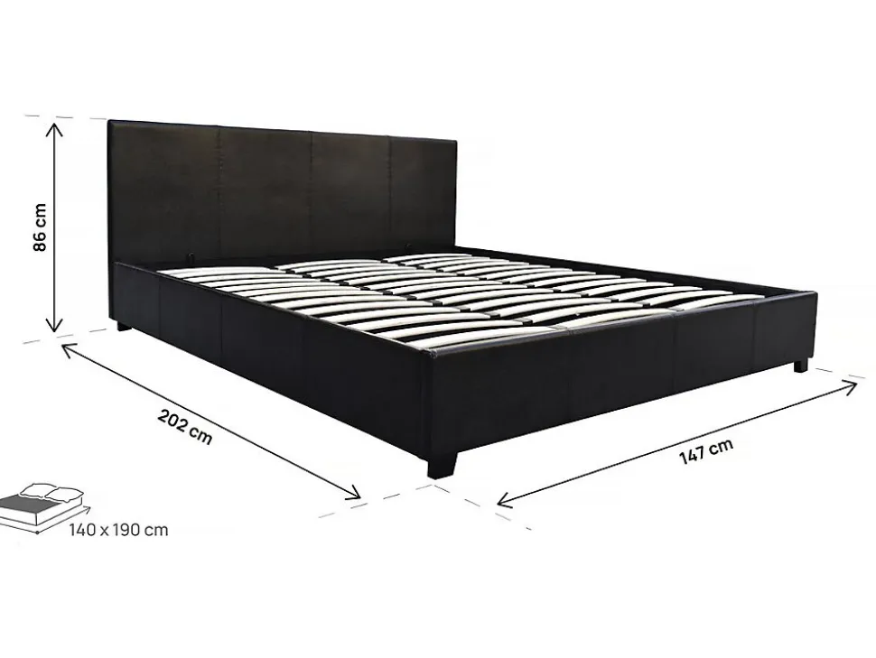 Lit « Carla »Offrez-vous un moment de détente avec ce lit double ! Idéal pour tous les univers de décoration, il ira à ravir avec votre chambre. Ajoutez un matelas de notre gamme et passez un instant privilégié dans votre petit chez vous. C’est cadeau !Un coffre de rangement intégré vous permettra en plus de dissimuler toutes vos affaires !Existe en plusieurs dimensions. Existe en plusieurs coloris. Lit coffre double « Carla » – Noir – Coffre de rangement en toile – Dimensions lit : 202 x 147 x 86 cm – Dimensions matelas : 140 x 190 cm – Sommier inclus .Descriptif: Apportez un changement à votre quotidien avec notre lit Carla – Sommier à lattes et tête de lit inclus – Matelas vendu séparément – Fond du coffre en toileMatière(Filtre): Simili cuirMatières: Simili cuirStructure: boisCouleurs: noircouleur (filtre): NoirDimensions: 147 x 202 x 86 cmDimensions du couchage: 140 x 190 cmDimensions (Filtre): 140 x 190 cmSommier: inclusSommier: Dimensions lattes : 65 x 5.2 x 0.9 cm Nombre de lattes : 26 – ContreplaquéCoffres: 142 x 192 x 24 cmFond du coffre en toilepieds: 6 x 3 x 5 cmPoids: 44.5 kgColisage: 2 colis : – 1,495 x 1,015 x 0,07 m, 15,5 kg – 2 x 0,275 x 0,155 m, 29 kg