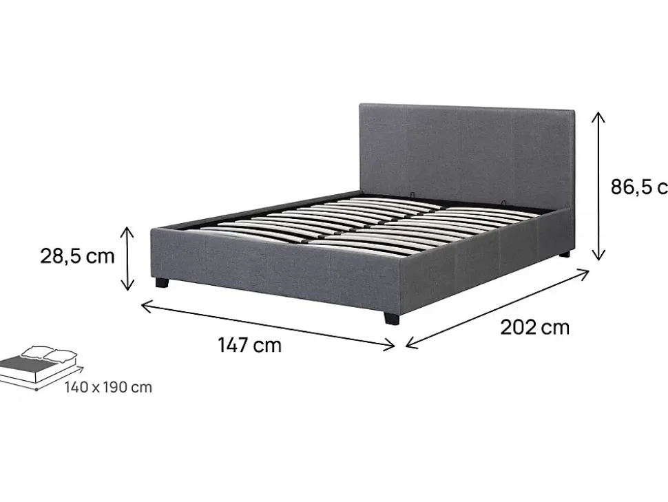Lit « Carla »Offrez-vous un moment de détente avec ce lit double ! Idéal pour tous les univers de décoration, il ira à ravir avec votre chambre. Ajoutez un matelas de notre gamme et passez un instant privilégié dans votre petit chez vous. C’est cadeau !Un coffre de rangement intégré vous permettra en plus de dissimuler toutes vos affaires !Existe en plusieurs dimensions. Existe en plusieurs coloris. Lit coffre double « Carla » – Gris – Coffre de rangement en toile – Dimensions lit : 203 x 147 x 86 cm – Dimensions matelas : 140 x 190 cm – Sommier inclus .Descriptif: Apportez un changement à votre quotidien avec notre lit Carla – Sommier à lattes et tête de lit inclus – Matelas vendu séparément – Fond du coffre en toileMatières: TissuMatière(Filtre): TissusCouleurs: GrisFinition: Polyestercouleur (filtre): Gris.Dimensions: 203 x 147 x 86 cmDimensions du couchage: 140 x 190 cmDimensions (Filtre): 140 x 190 cmSommier: Dimensions lattes : 65 x 5.2 x 0.9 cm Nombre de lattes : 26 – ContreplaquéCoffres: 142 x 192 x 24 cmFond du coffre en toilepieds: 6 x 3 x 5 cmPoids: 44.5 kgColisage: 2 colis : – 1,5 x 1,02 x 0,07 m, 16,2 kg – 2,02 x 0,275 x 0,16 m, 28,5 kg