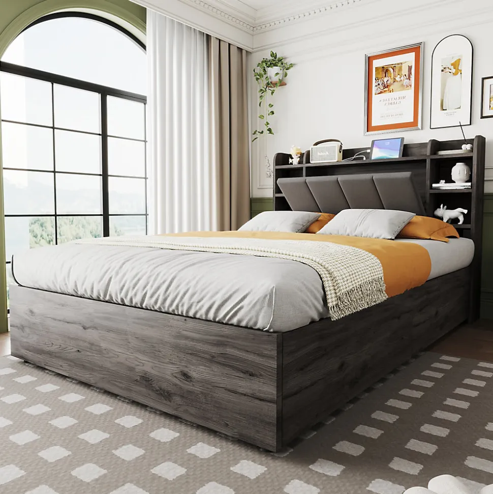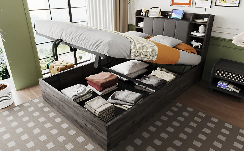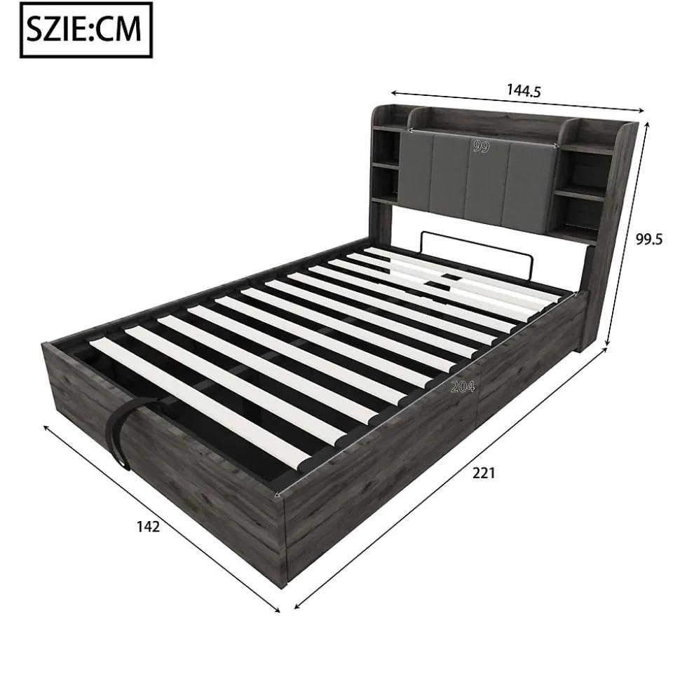 Fonction de rangement hydraulique : Ce lit simple dispose d’une structure hydraulique permettant d’optimiser l’espace. Sous le lit, vous pouvez ranger des vêtements, du linge de lit et d’autres objets. (Avant utilisation, il faut d’abord poser le matelas puis appuyer vers le bas.)Prise combinée USB et Type-C : Cette prise de charge pour lit hydraulique comprend 3 ports USB et 1 port Type-C, permettant de charger plusieurs appareils. (Avis de sécurité : utilisez de préférence 1 à 3 ports simultanément pour éviter toute surcharge électrique et tout accident.)Plusieurs compartiments : La tête de lit en bois dispose de plusieurs petits compartiments pour ranger différents objets tels que réveil, jouets, tasses ou décorations, répondant à divers besoins.Grand espace de rangement caché : Derrière le dossier rembourré de la tête de lit se trouve un grand compartiment pour ranger de gros objets. Le dossier est bien rembourré pour un confort optimal lorsqu’on s’y appuie. Idéal pour les studios ou petits appartements.